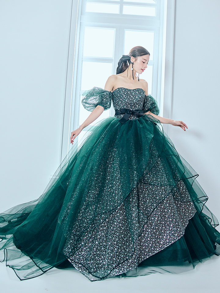 「小さな薔薇の花模様」のオリジナルグリッタープリントがキラキラ輝くインパクト大のグリッタードレス。ライトアップされた会場で存在感を放つこと間違いなしです!