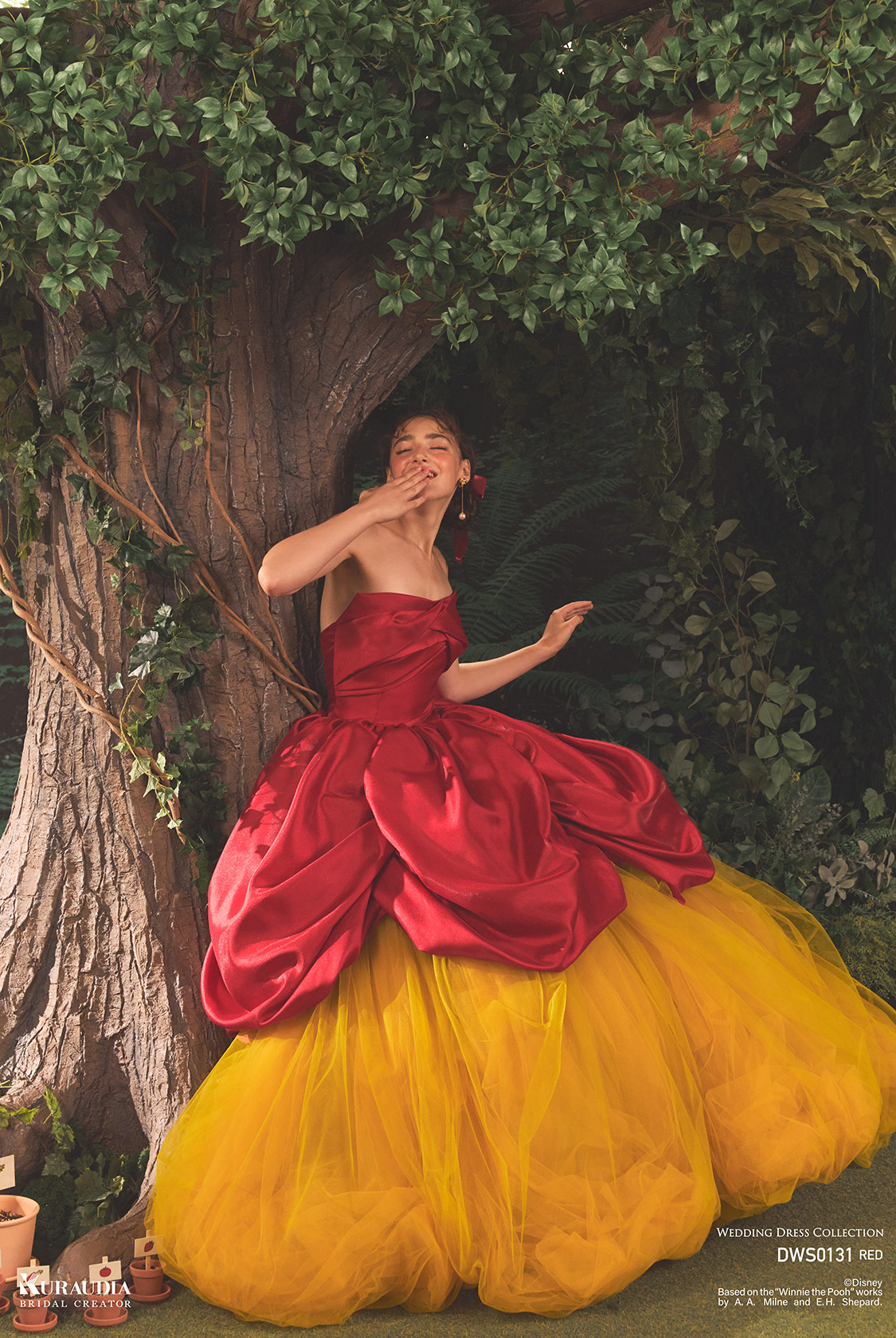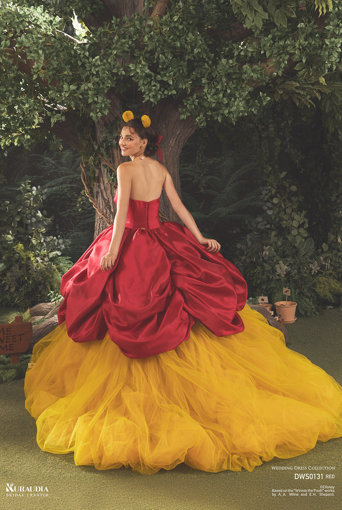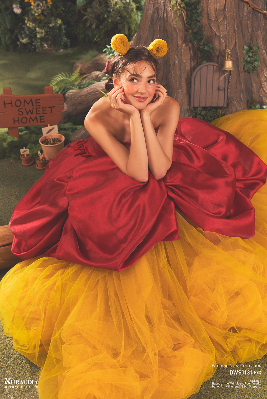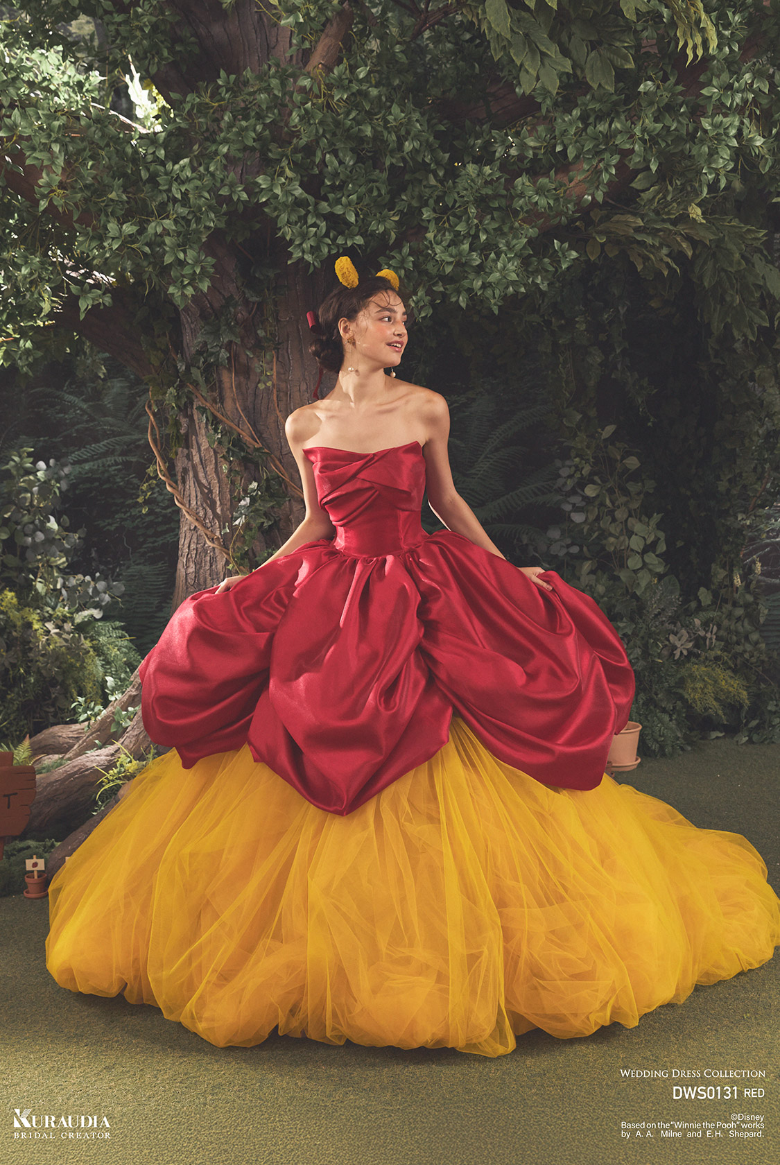 「くまのプーさん」のカラーを取り入れた、大人の売カラードレス。ミカド素材のテクニカルな身頃に、「くまのプーさん」のフォルムを表現したバルーンのディテールが目を引く一着です。