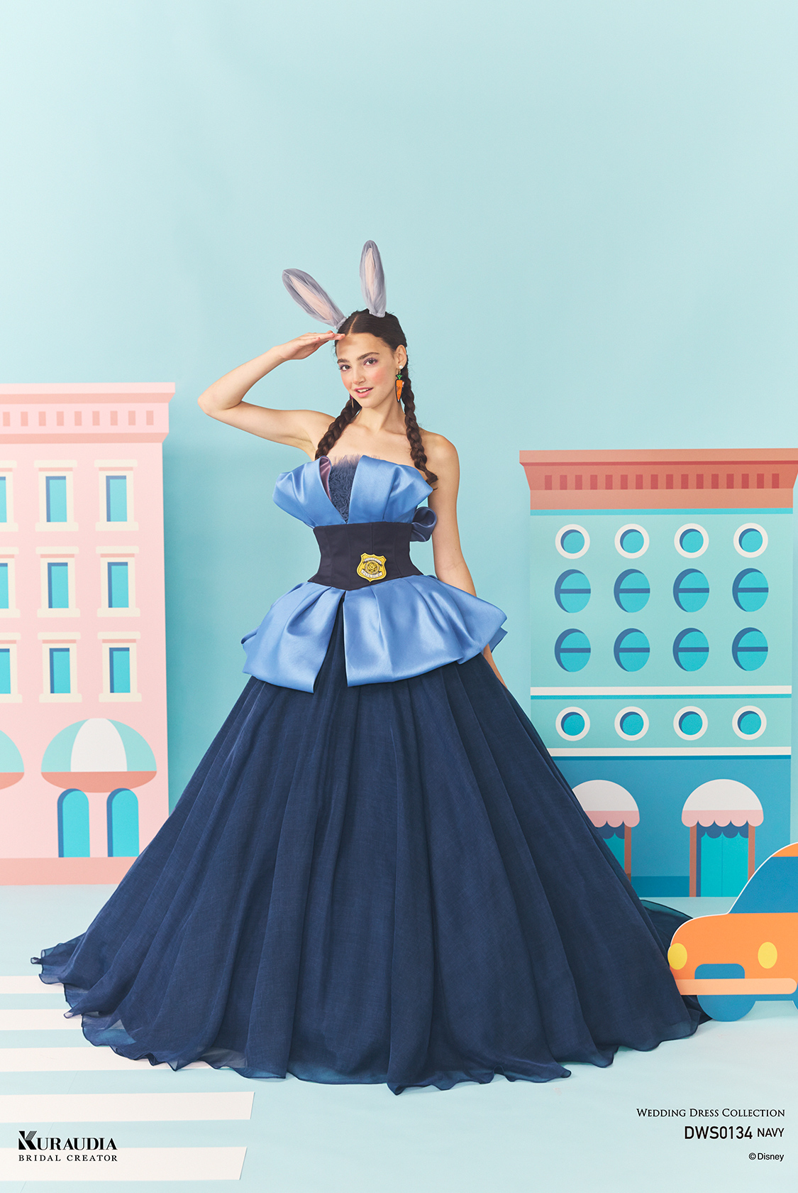 耳を表現した胸元の立体的な飾りや、警察官バッチ、しっぽを表現したチュールの飾りなど、「ジュディ・ホップス」からインスパイアされた遊び心があふれる一着です。