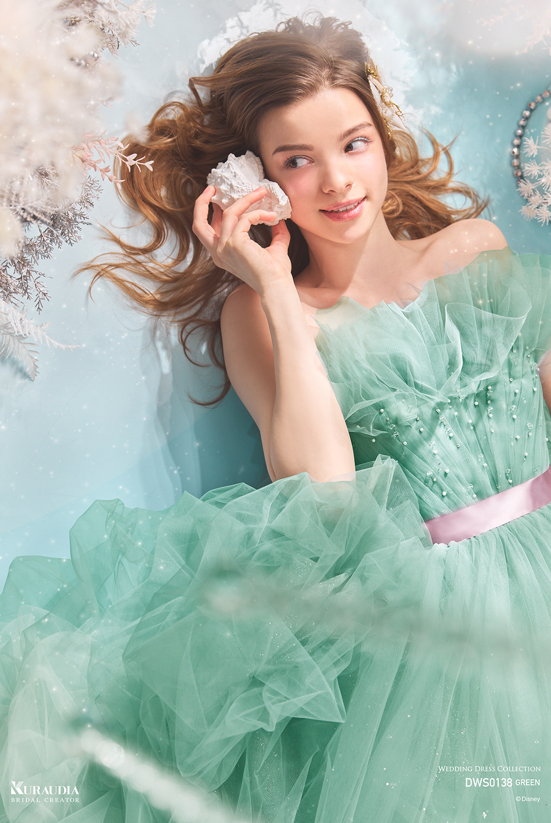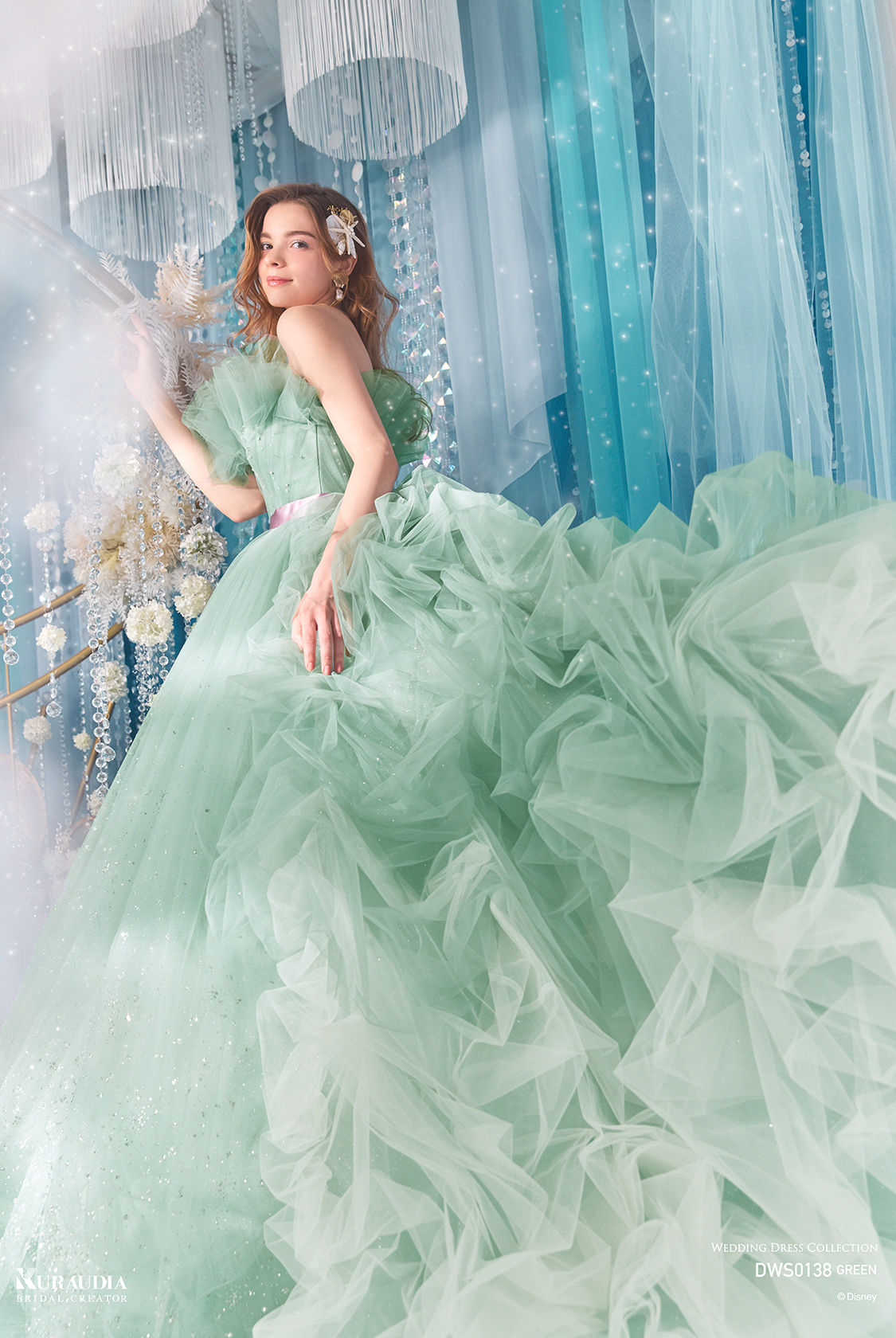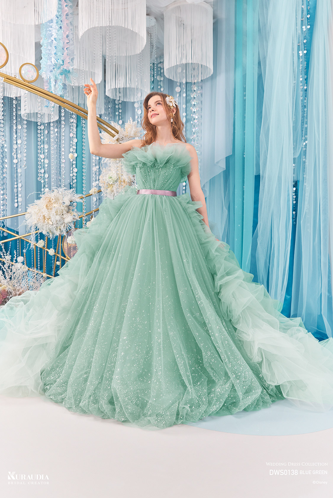 波のゆらめきを表現した達キングのスカートがポイントの、「アリエル」からインスパイアされたボリュームドレス。ブルーグリーンの美しいグラデーションと、パープルのウエストリボンが「アリエル」らしいカラーリングです。バルーンデザインの裾や、タッキングスカートの内側からは、海の中の光をイメージしたグリッターが光輝きます。動きのある立ち上がったドレープ身頃には、海の泡を表現したパールやビーズがあしらわれています。