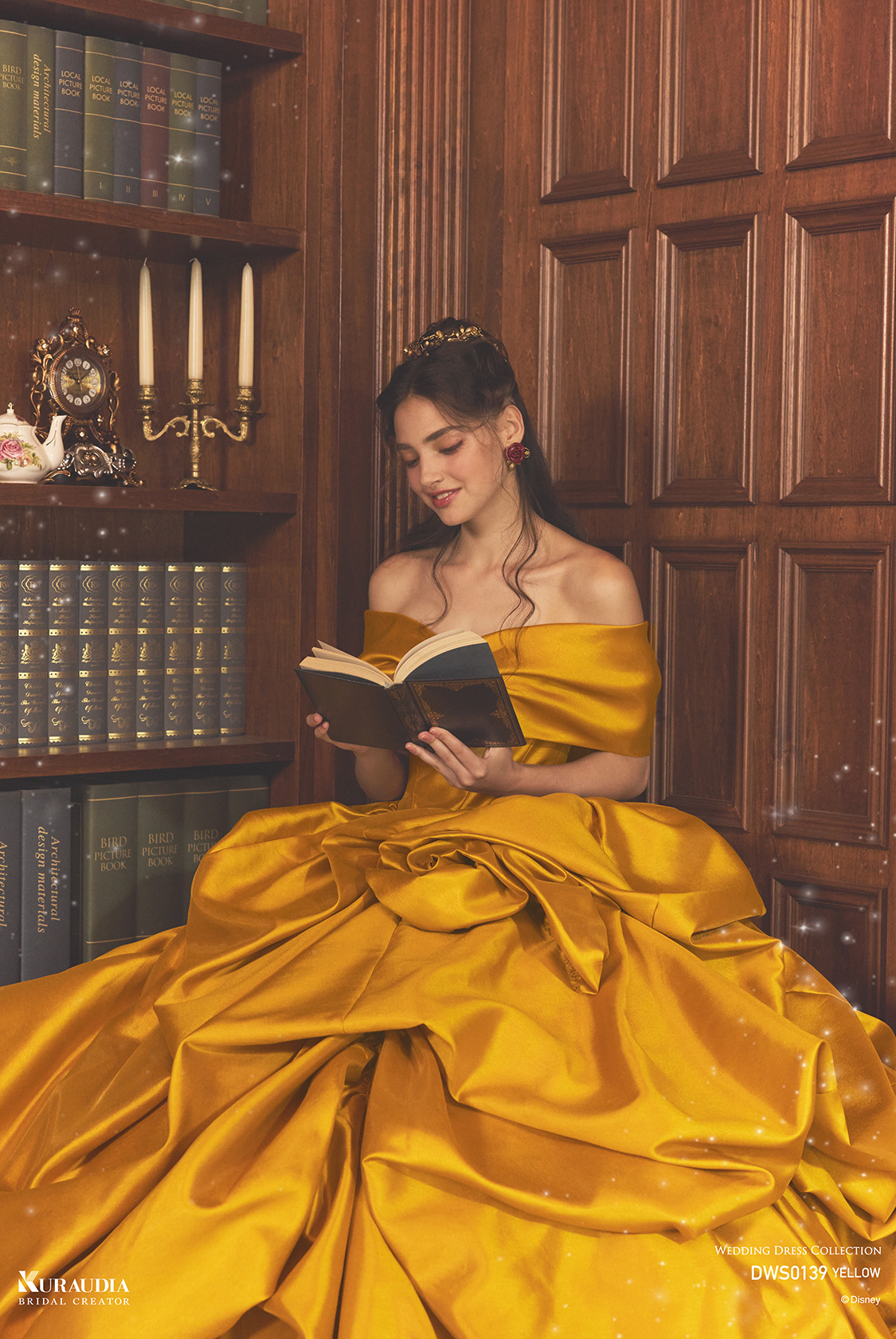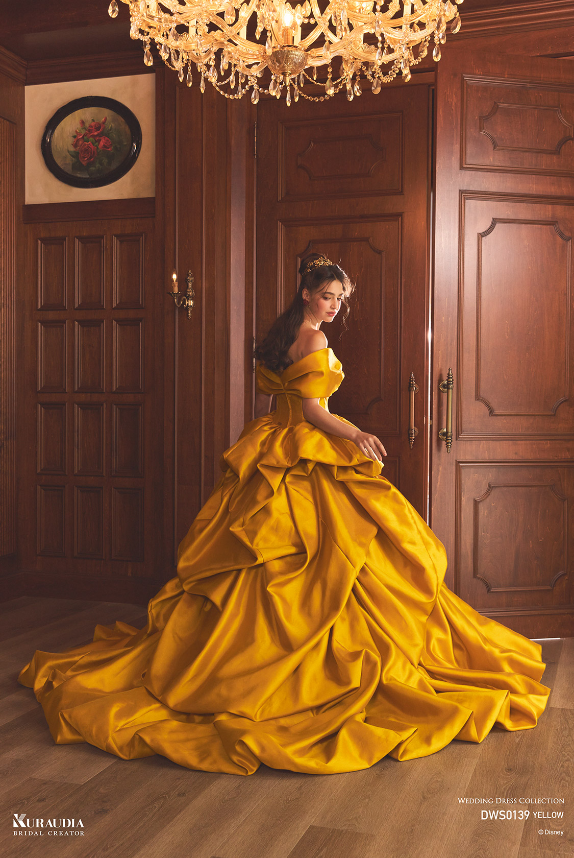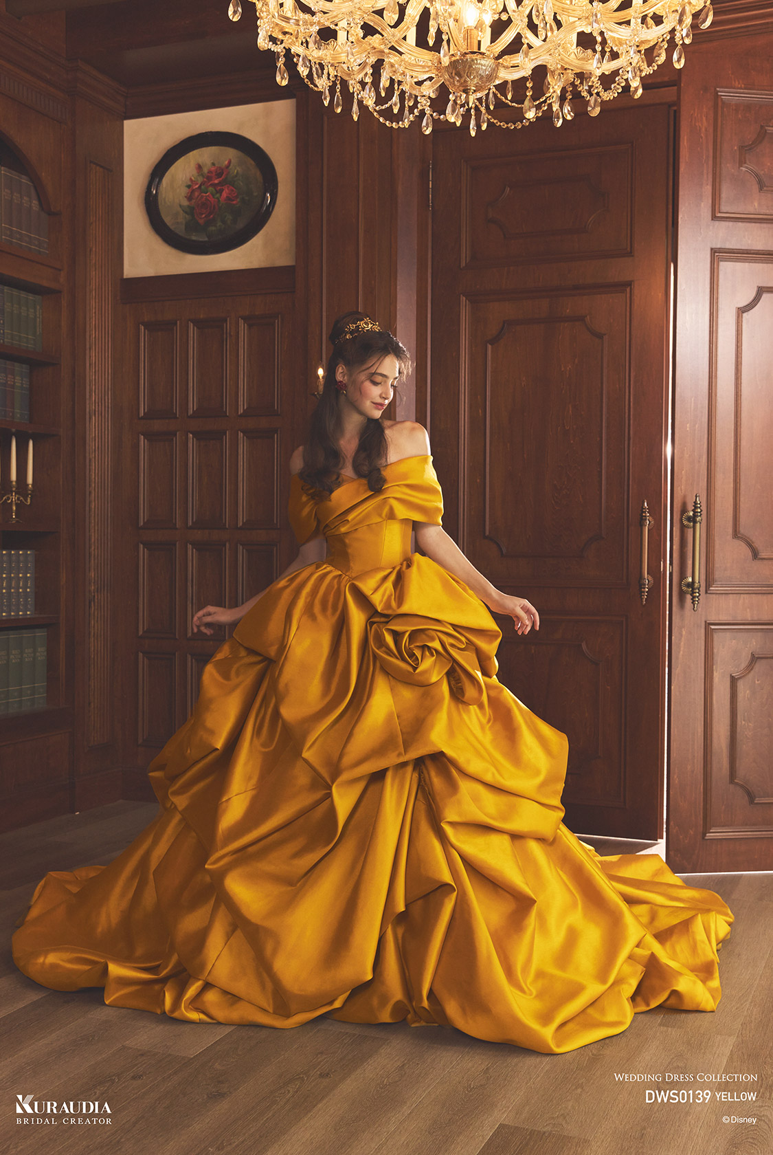 上品なイエローカラーのミカドを贅沢に使用し「ベル」をインスパイアしたドレス。スカートの左側には、「ベル」を象徴するバラのモチーフが表現されています。オフショルダーやスカートはテクニカルなドレーピングで、洗練された重厚感のある1着です。