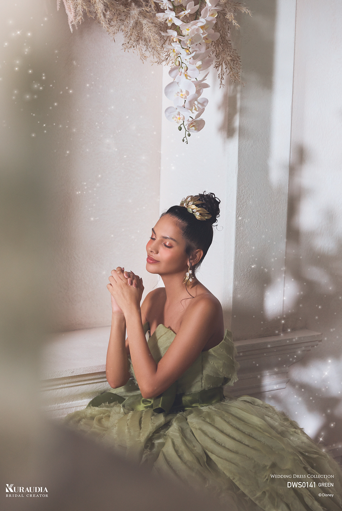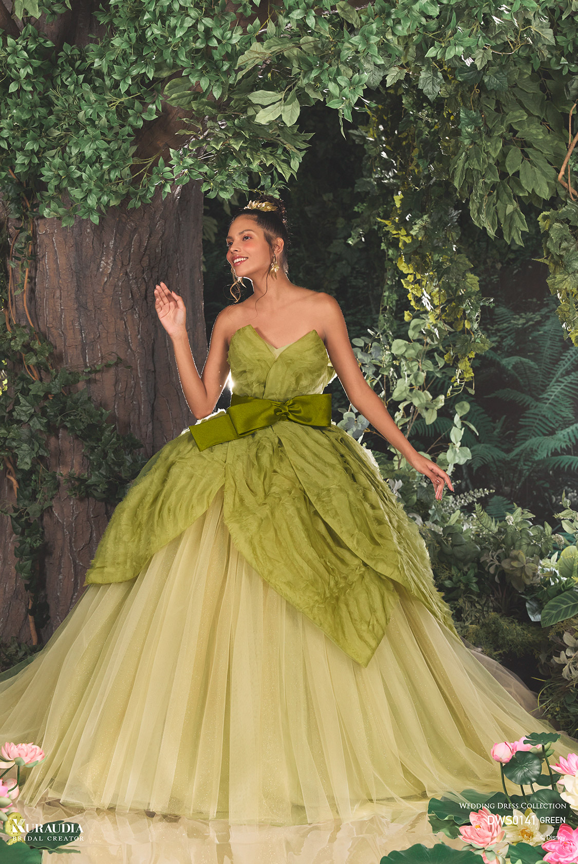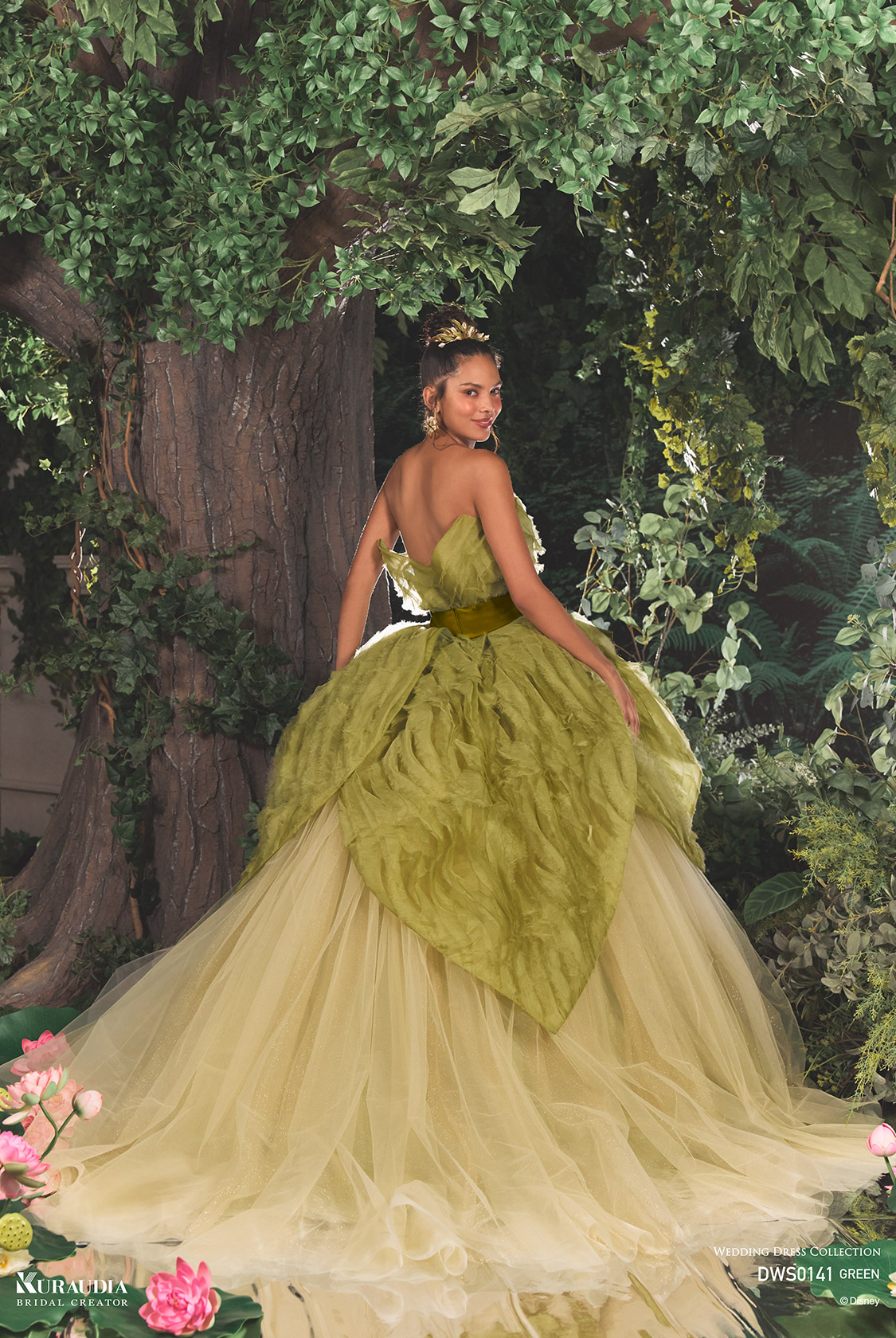 「ティアナ」を象徴する花びらのディテールを、オーガンジーフリルの生地を使用して表現。繊細なゴールドのフリッターチュールが魔法の煌めきを表現し、ミカド素材のリボンが全体を引き締める優美な1着です。