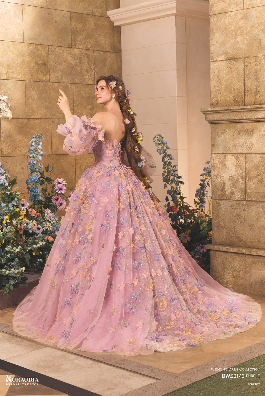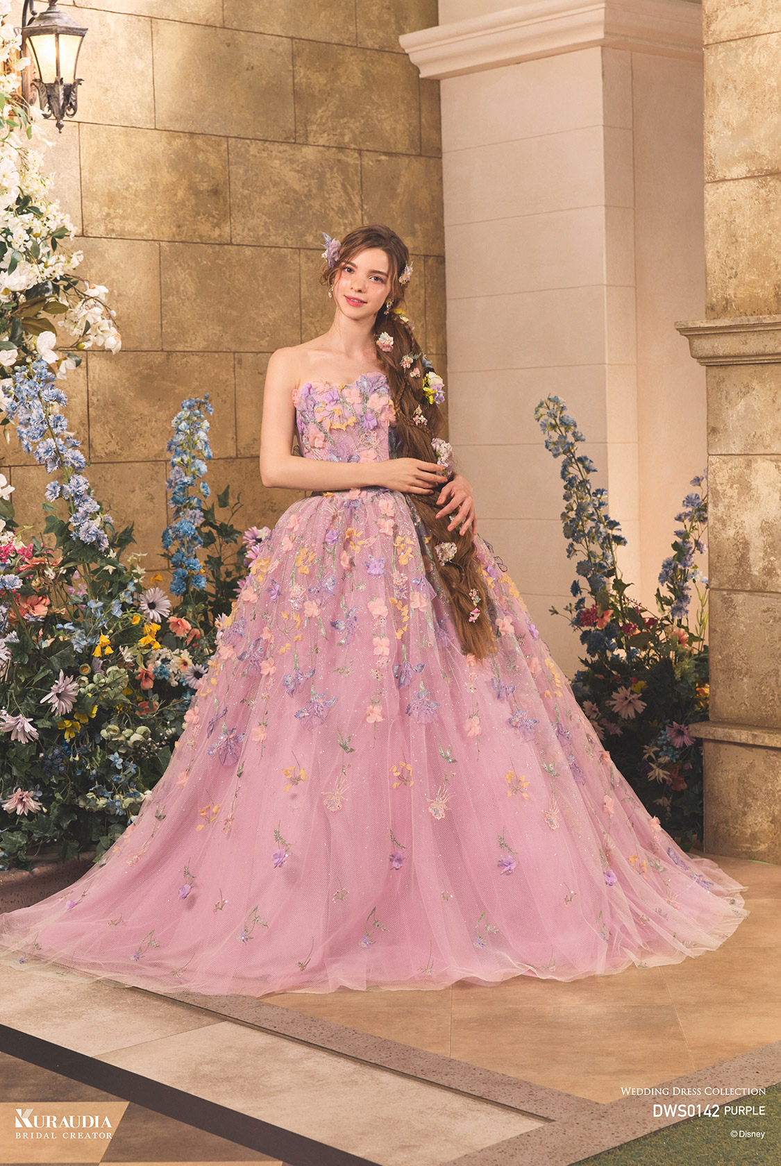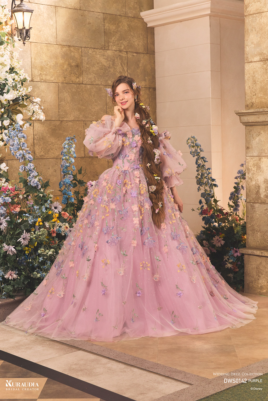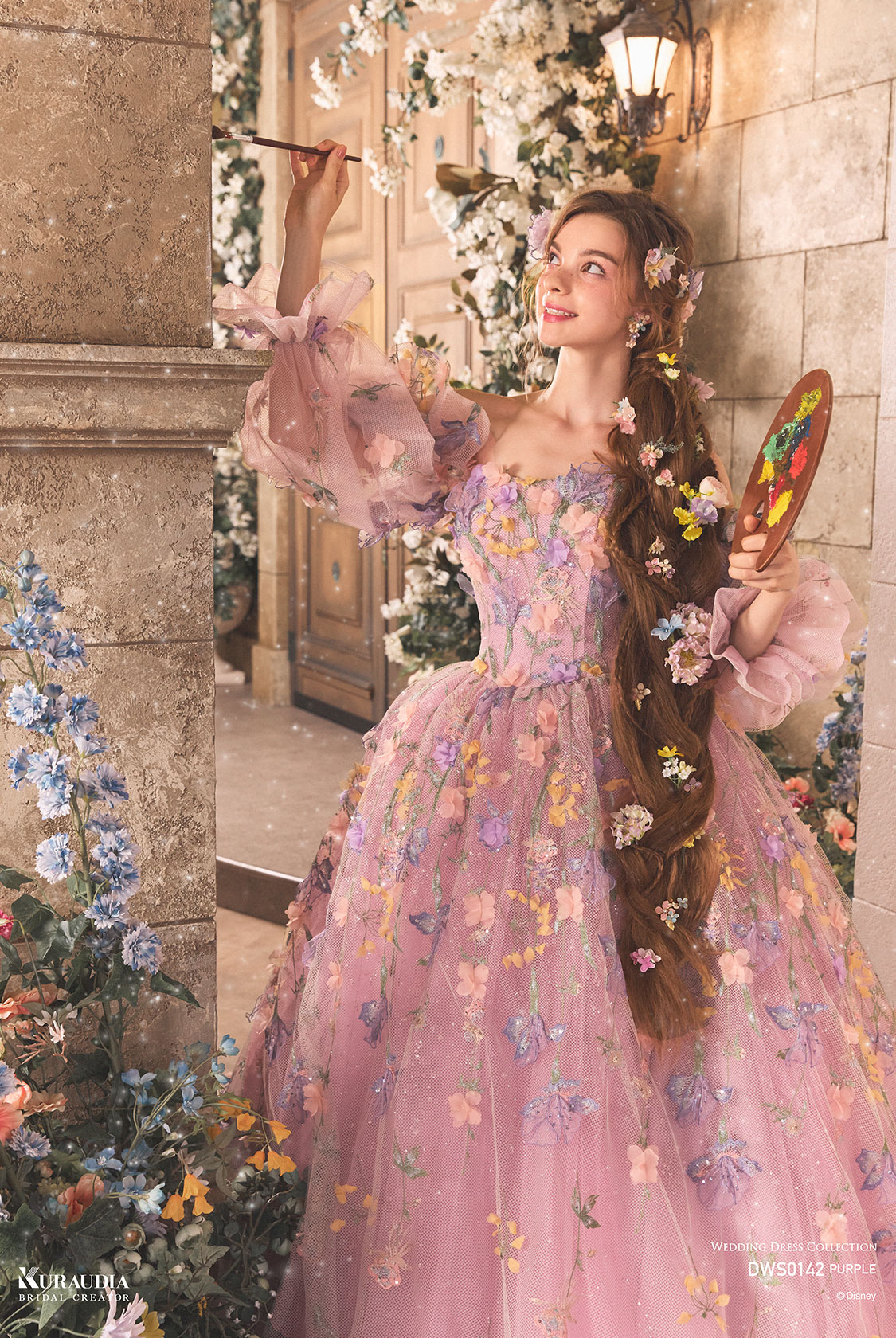 「ラプンツェル」らしいライトトーンのフラワーレースを全身に使用したスレンダードレス。内側からはグリッターが光輝き、身頃の後ろは「ラプンツェル」からインスパイアされた編み上げデザインになっています。