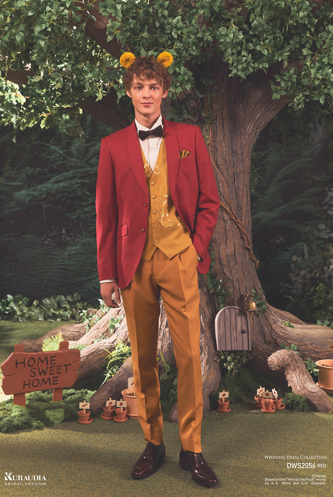 「くまのプーさん」にインスパイアされ、その色遣いをジャケット&ボトムのカラーコーディネートで表現したタキシード。ベストにはペアドレスお揃いの箔プリントをあしらい、よりキャラクターを意識したスタイルに仕上げました。