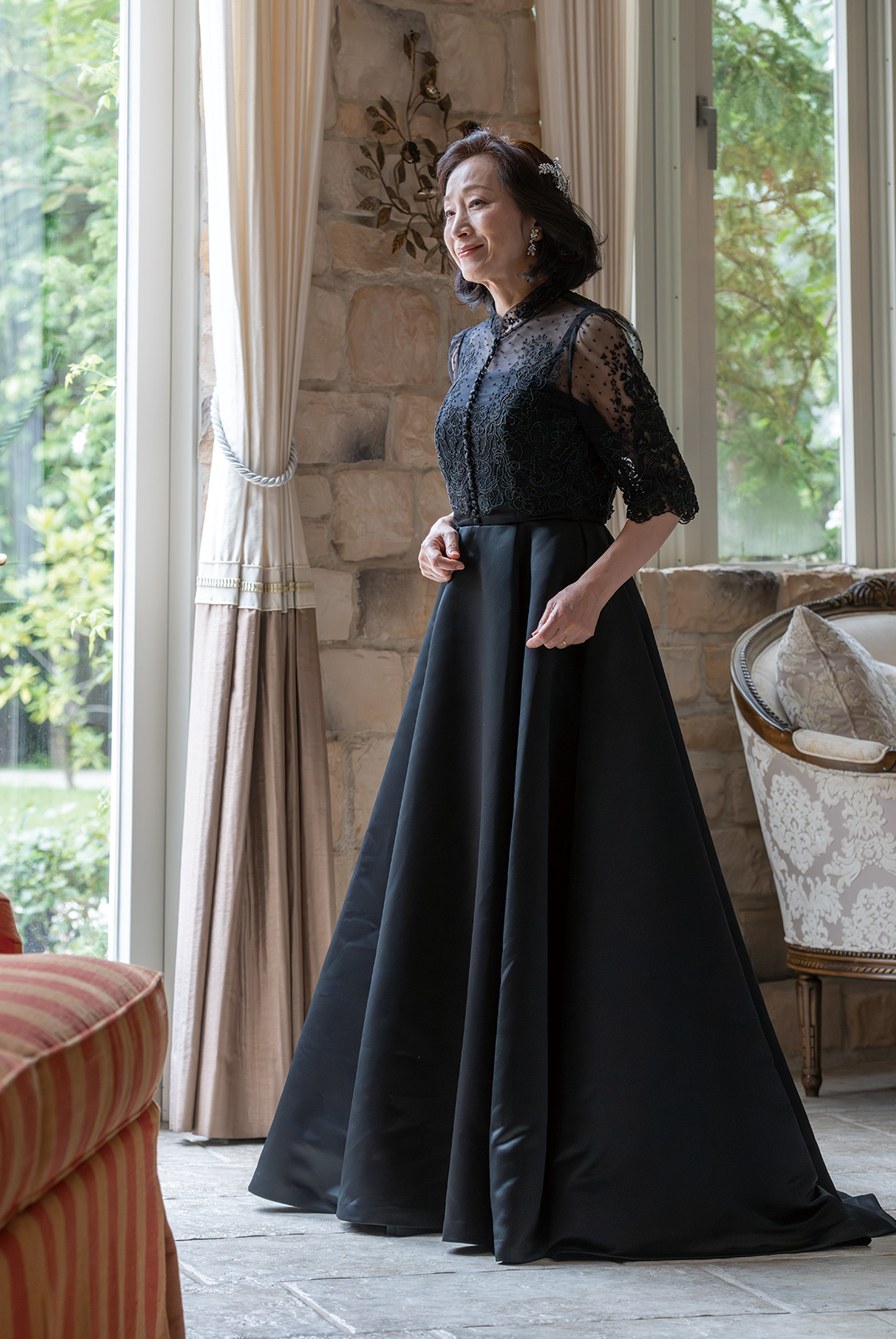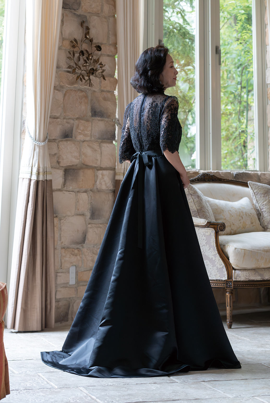 【マザードレス(クラシックの再解釈)】繊細レース×ブラックが導く、タイムレスなエレガンス。それは、伝統とモードの美しい融合。Made in Franceの上質なチュールレースを贅沢にあしらったトップは、まるでヴィンテージブラウスのようなクラシカルな佇まい。ドレス全体は、シンプルで凛とした縦のラインを描くシルエット。控えめでありながら、フォーマルとしての存在感は十分。まさに、留袖に代わる“今”の正統派ドレススタイル。漆黒のワントーンに、レースのテクスチャーとシルエットの妙。そこに宿るのは、古典美と現代性のバランスが生んだ、大人の知性と洗練。格式を纏いながらも、どこかモード。