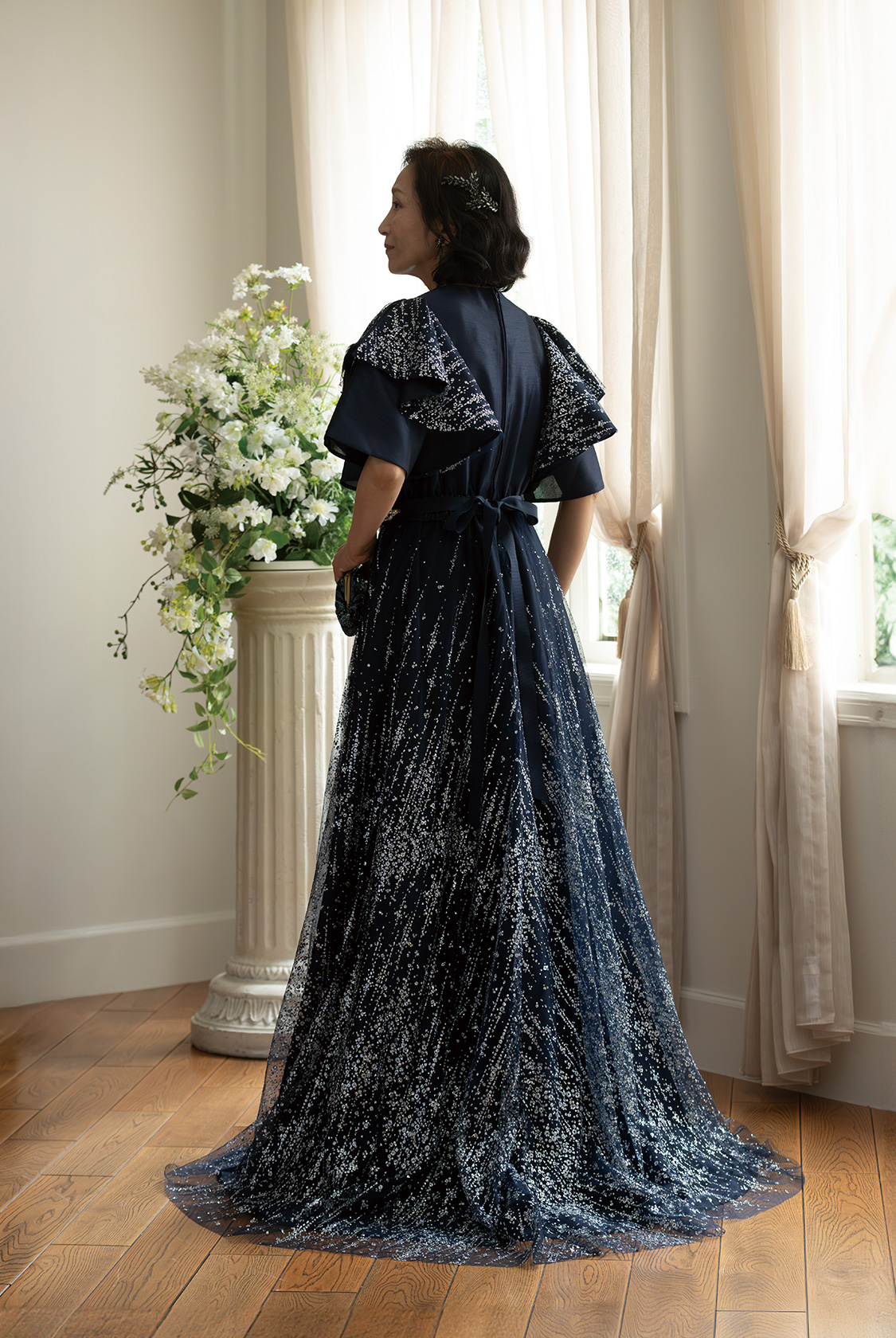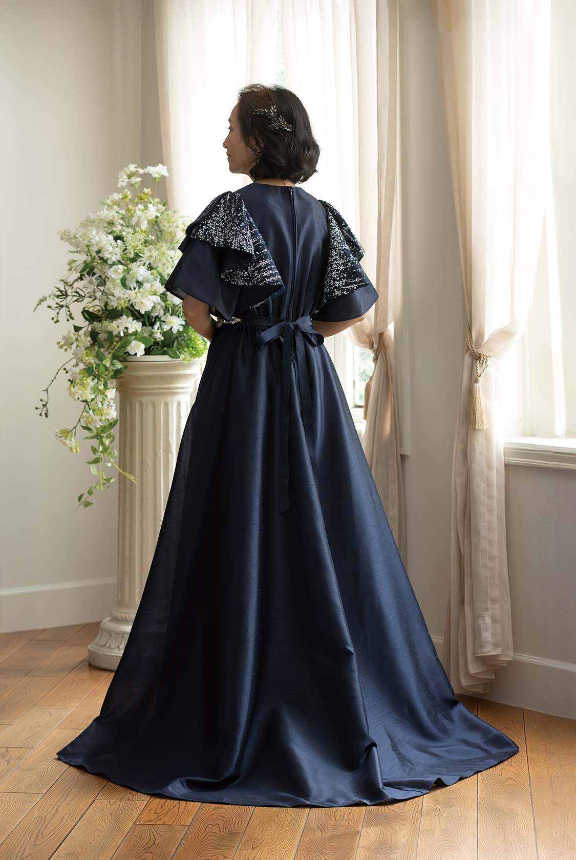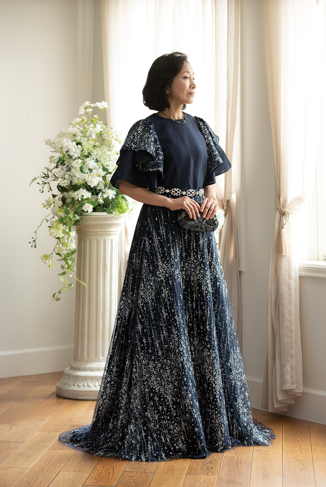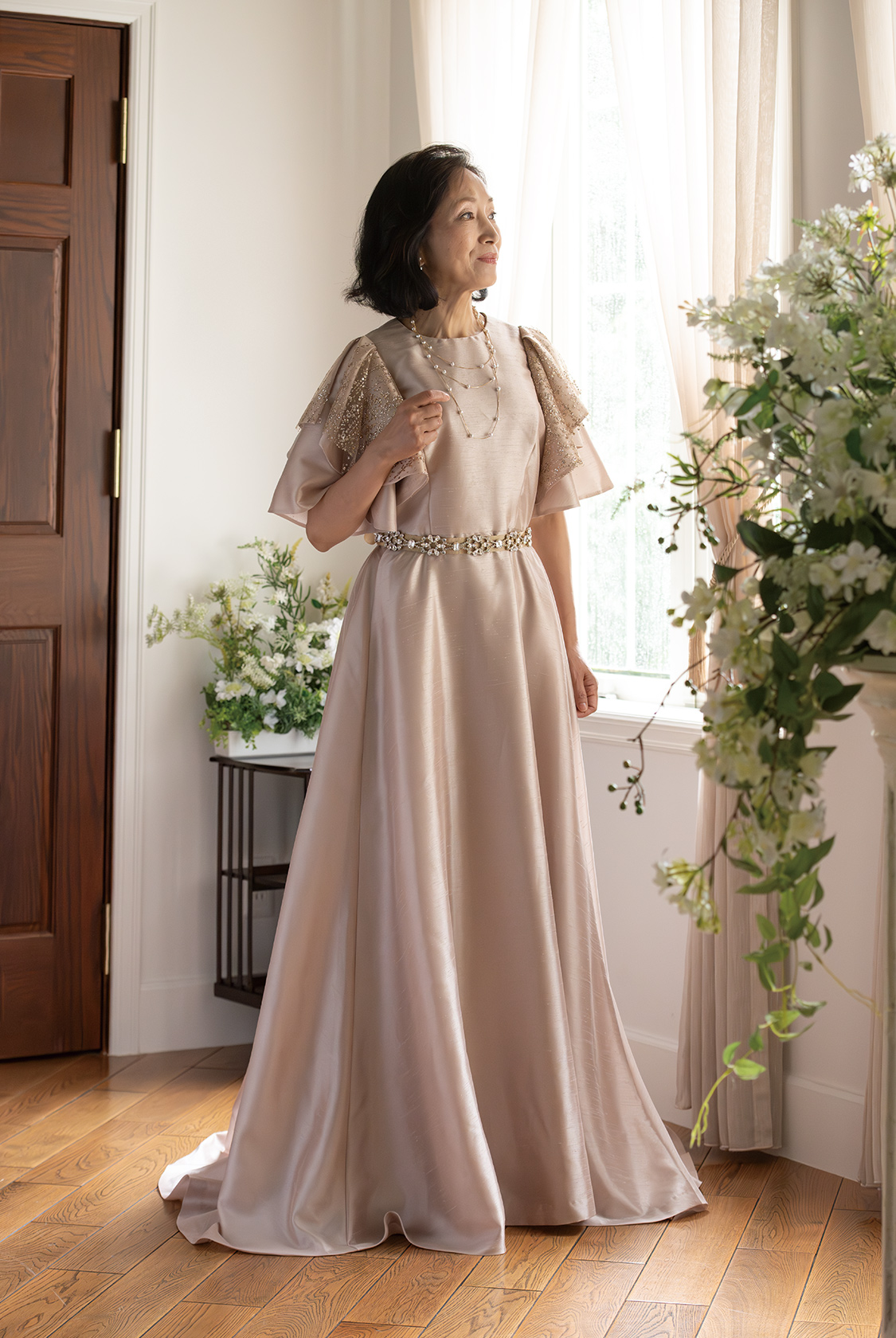 【マザードレス(新・セレモニースタイル)】母としての気品を、モードにまとう。繊細な光沢を放つシャンタン素材が、静かな高級感を漂わせるAラインドレス。広がりすぎない上品なシルエットは、控えめでありながらも圧倒的な洗練を感じさせる。首元は小さめのラウンドネックでミニマルに整え、デコルテを程よくカバー。仕立ての美しさが際立つこの一着は、ただの“きれい”では終わらない。袖にはふんわりと重ねられたラッフルが揺れ、動きに合わせて優雅な陰影を描く。そして視線を奪うのは、オーバースカートにレイヤードされたグリッターチュール。月の雫のように繊細にきらめきながら、フォーマルの枠を超えたさりげない存在感を放つ。大切な一日に、母としての品格と華やぎを纏う、新しい選択肢。