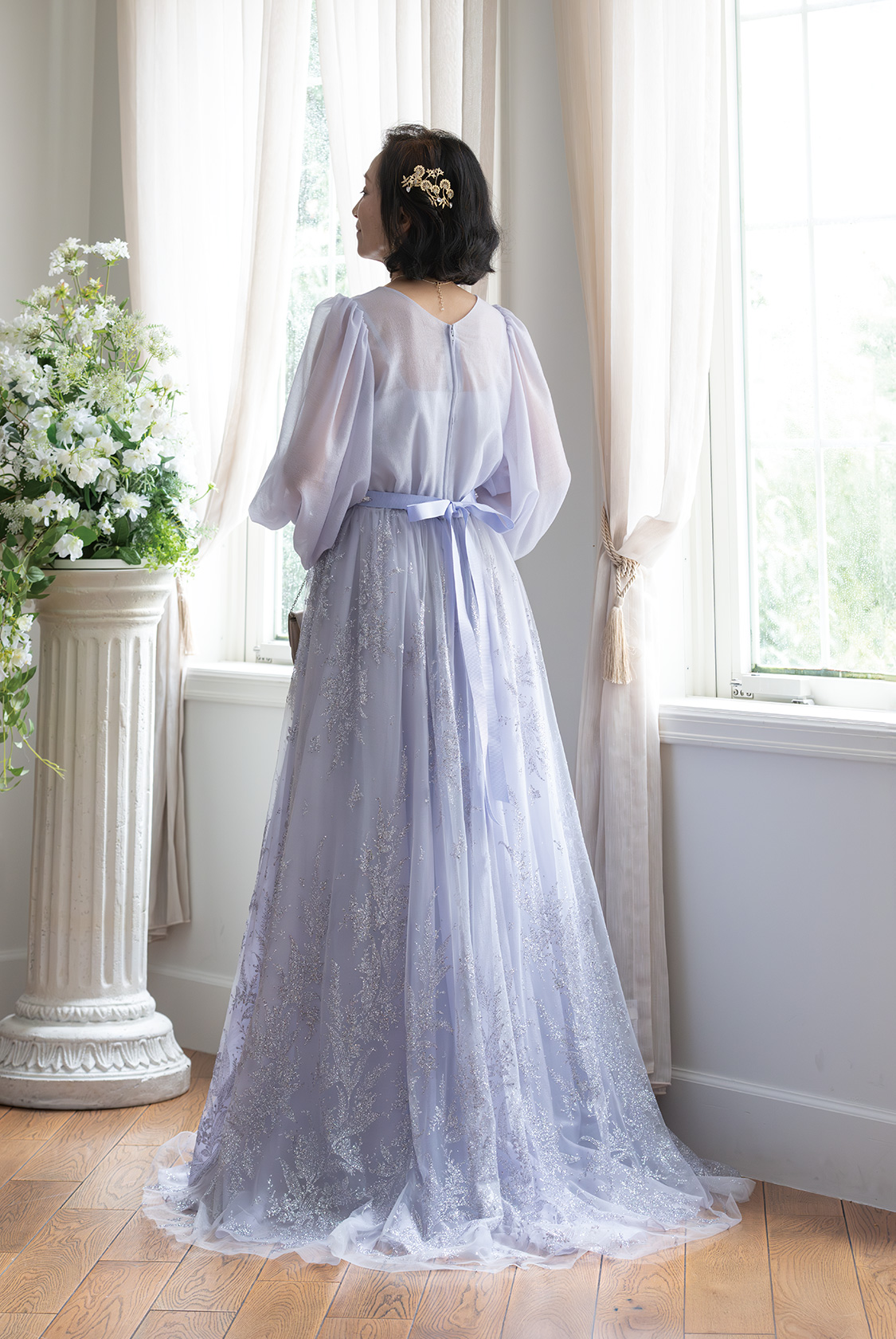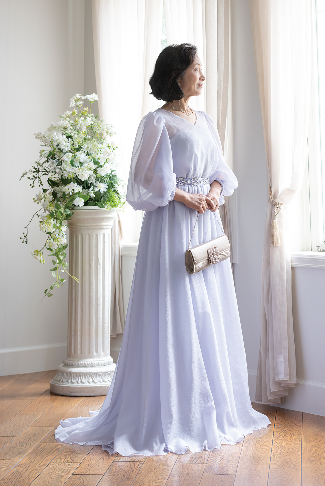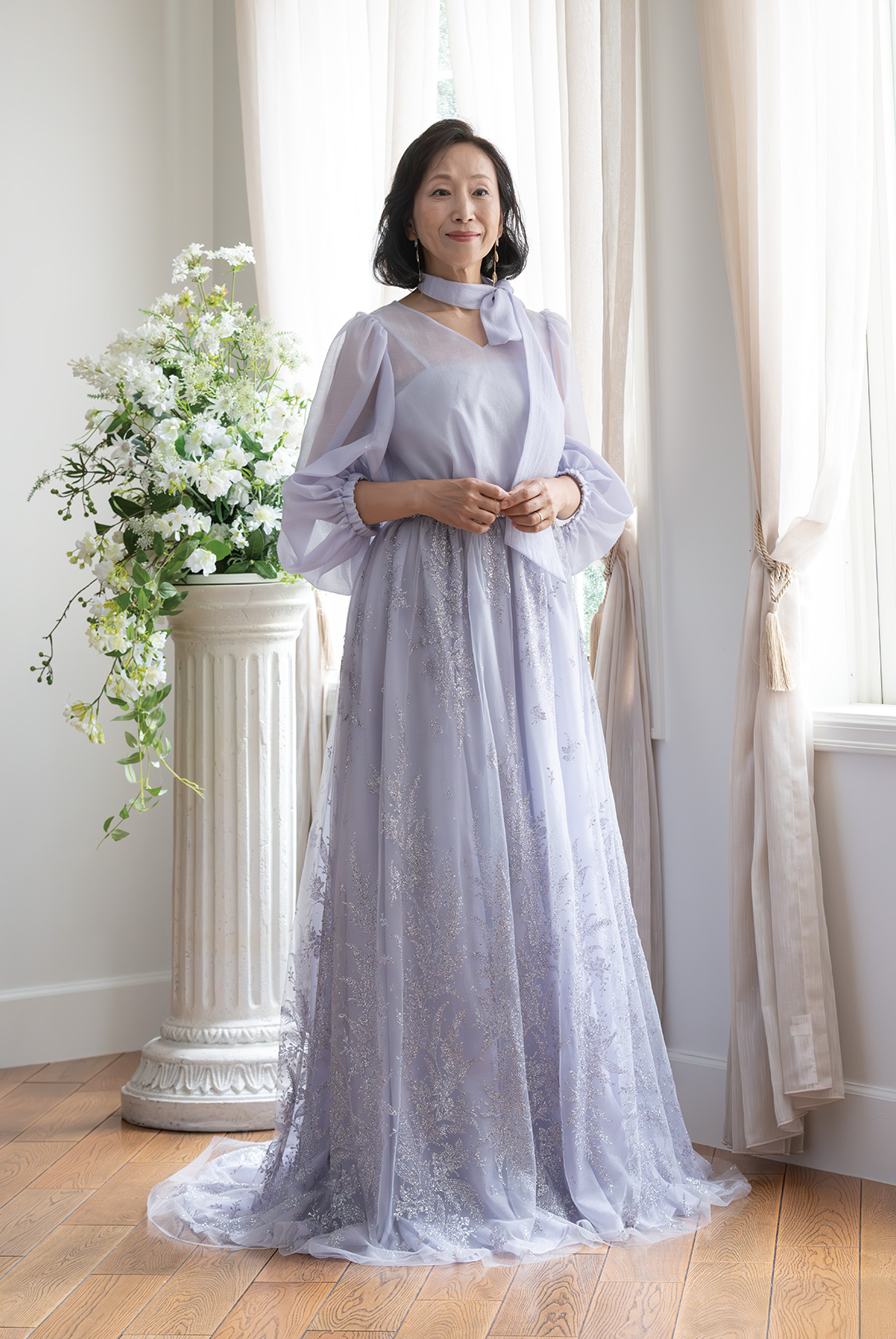 【マザードレス(大人フェミニン)】透け感、ニュアンス、そしてきらめき。最新フォーマルスタイル。軽やかに揺れるシフォンオーガンジーが、歩くたびにドラマを生む。ほんのり肌を透かす絶妙なシアー感と、柔らかなニュアンスカラーが、シンプルながらも奥行きのある表情を演出。グリッターがほのかにきらめくオーバースカートは、抜け感のある華やぎをプラスし、フォーマルの常識に新しいエレガンスを刻む。首元にリボンスカーフをひと巻きすれば、気になる部分をさりげなくカバーしながら、スタイル全体にモードな空気を添えて。花嫁のドレスと色をリンクさせれば、ゲストスタイルに品格とトレンド感が共存。“ただきれい”では物足りない、大人のフォーマルにこそ、個性と洗練を。