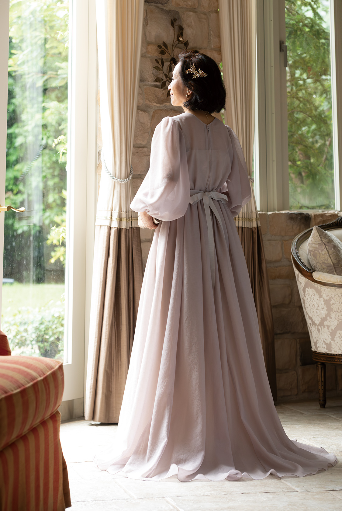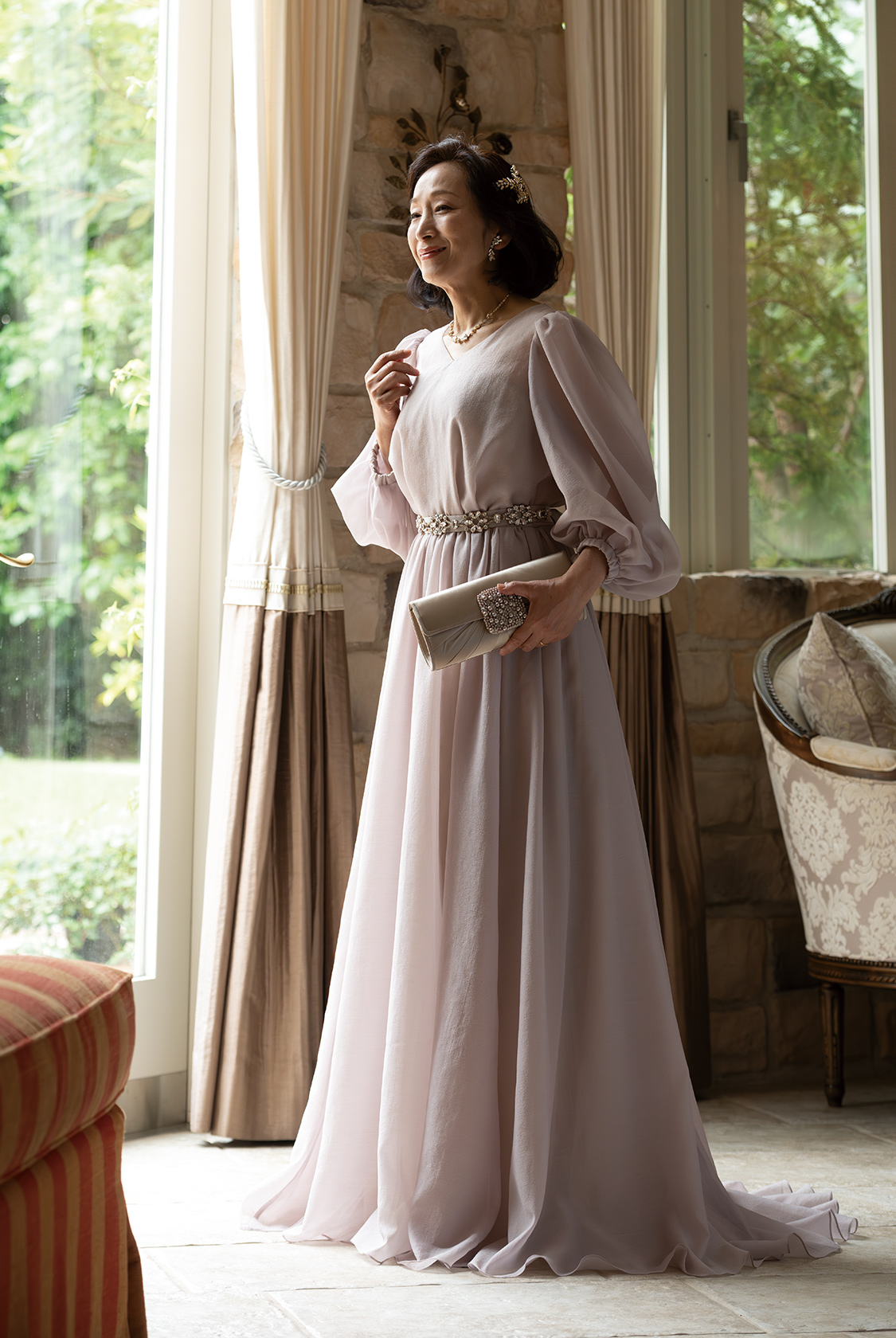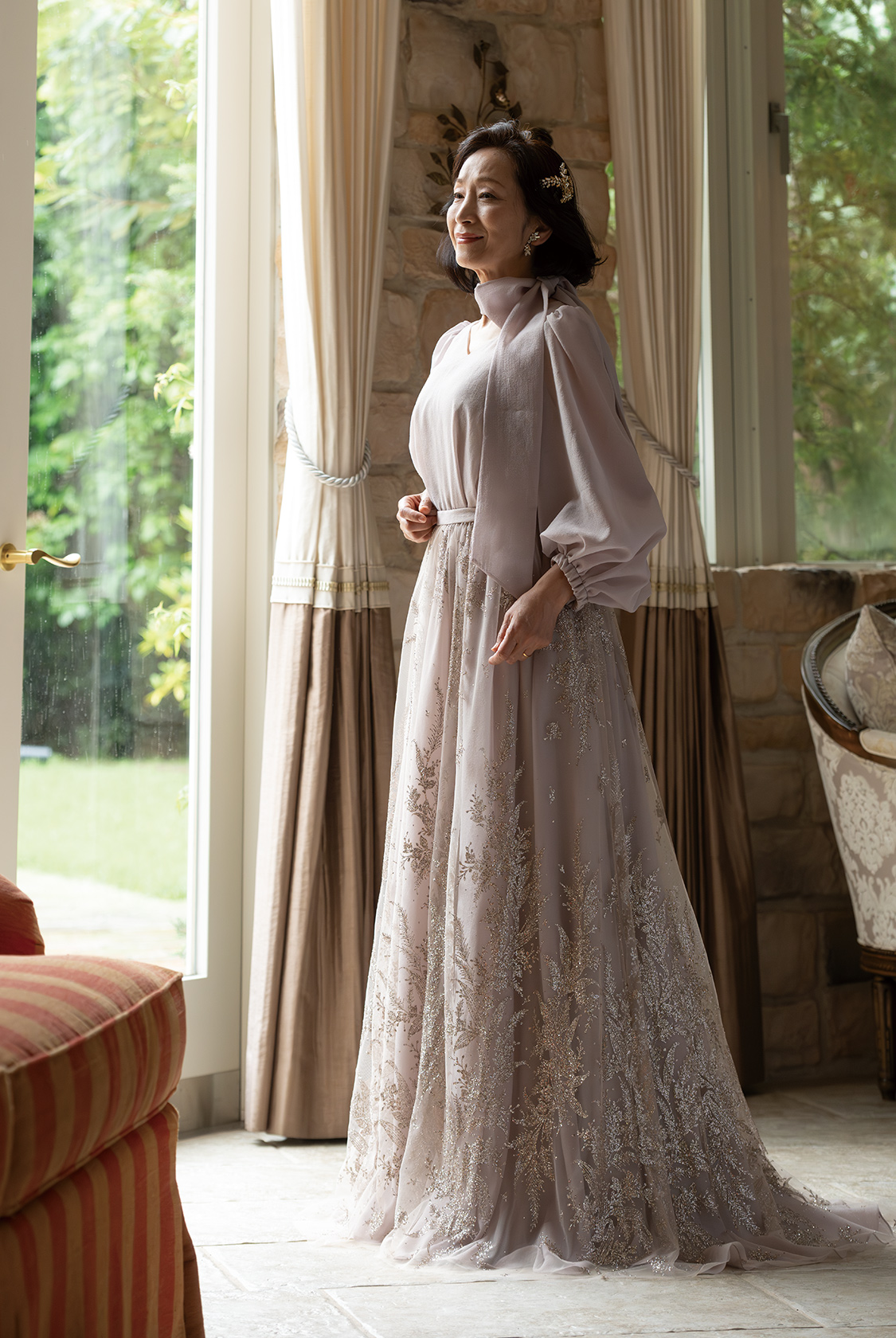 【マザードレス(大人フェミニン)】透け感、ニュアンス、そしてきらめき。最新フォーマルスタイル。軽やかに揺れるシフォンオーガンジーが、歩くたびにドラマを生む。ほんのり肌を透かす絶妙なシアー感と、柔らかなニュアンスカラーが、シンプルながらも奥行きのある表情を演出。グリッターがほのかにきらめくオーバースカートは、抜け感のある華やぎをプラスし、フォーマルの常識に新しいエレガンスを刻む。首元にリボンスカーフをひと巻きすれば、気になる部分をさりげなくカバーしながら、スタイル全体にモードな空気を添えて。花嫁のドレスと色をリンクさせれば、ゲストスタイルに品格とトレンド感が共存。“ただきれい”では物足りない、大人のフォーマルにこそ、個性と洗練を。