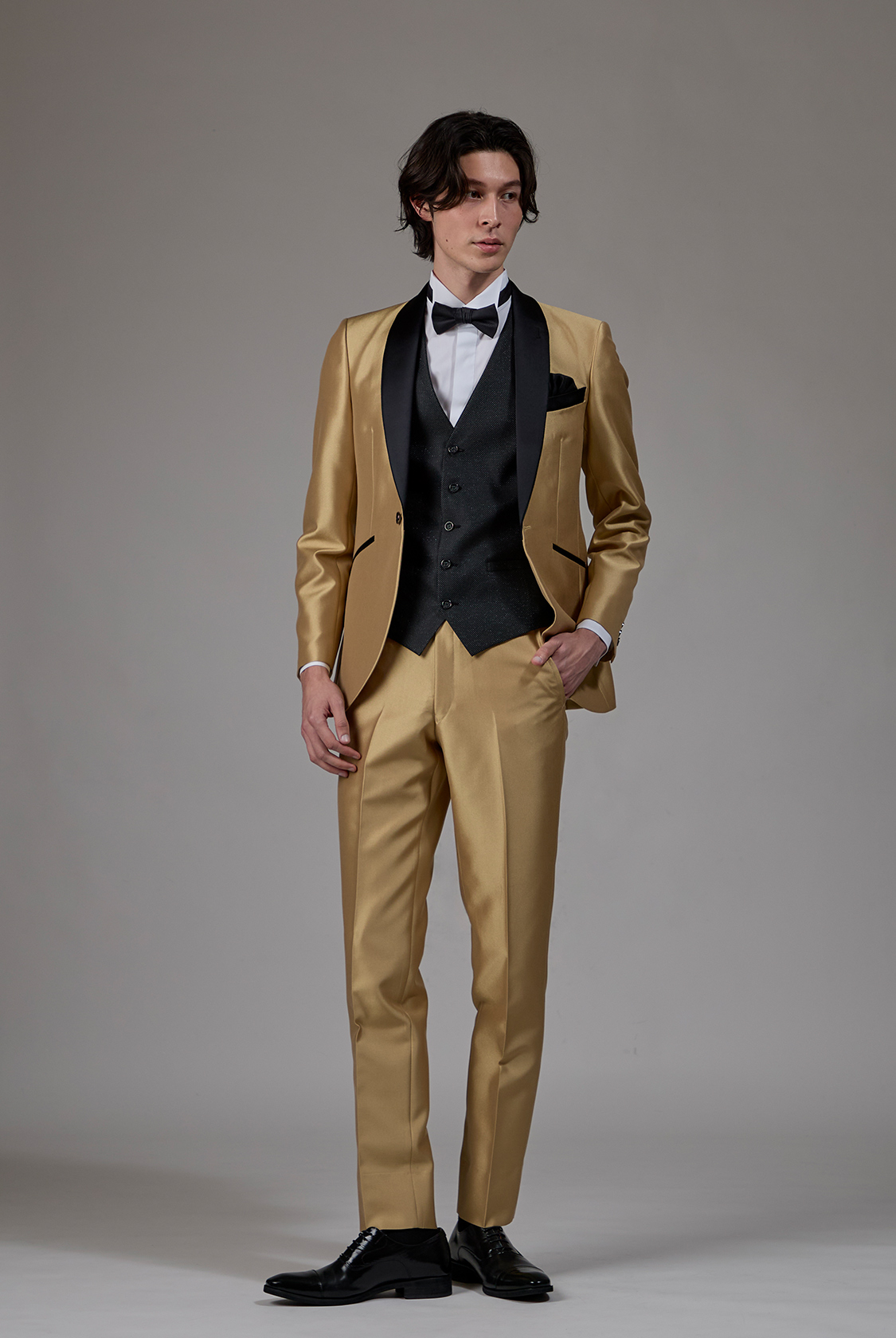 パッと目を引くゴールド系の光沢素材に黒サテンのショールカラーをあしらい、カラーコントラストによる引き締め効果を狙ったスタイリングタキシード。