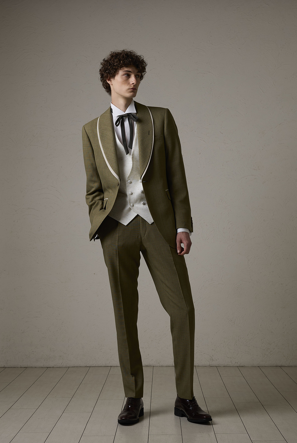 マットで落ち着きのあるトップ(霜降り)グリーンを基調にしたショールカラータキシード。自然を感じさせる色味でありながら、フォーマルシーンにもなじむ上品な印象に仕上げています。ショールカラーにはレイヤードカラーを採用し、ポケットの玉縁布と外廻りの襟にはアイボリー色を配することで、グリーンの色調を引き立てながら軽やかさをプラス。
