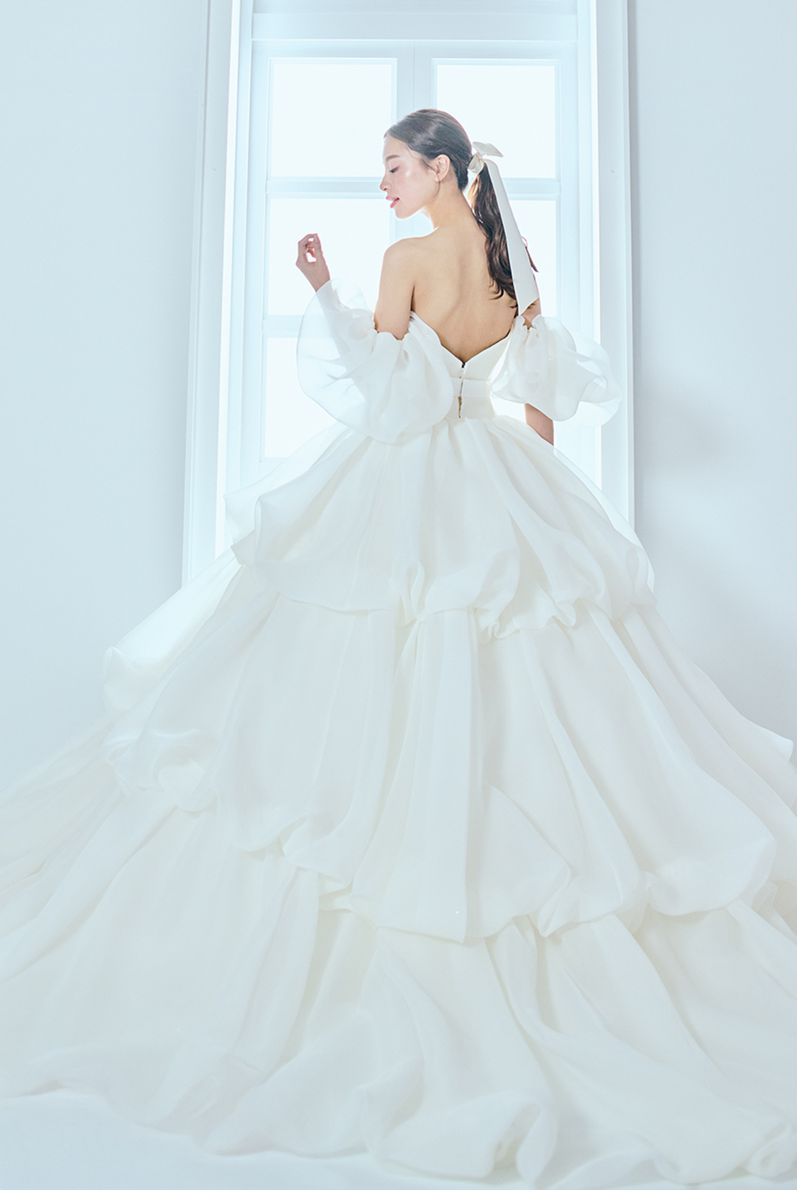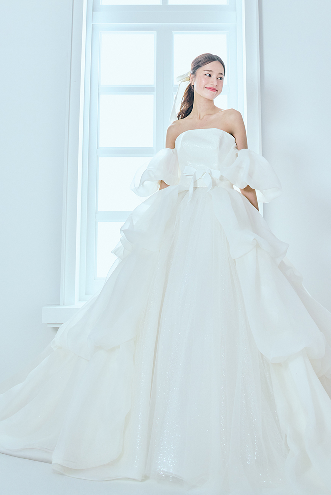 オーバースカートのサイドに3段に重なるパッフィングは計算されたバランスで360度どこから見ても美しく、スタイルアップ効果も兼ね備えています。サテンオーガンジーのエアリー感がトレンドスタイルの仕上がりに。