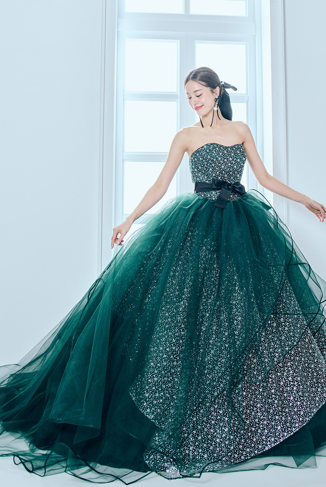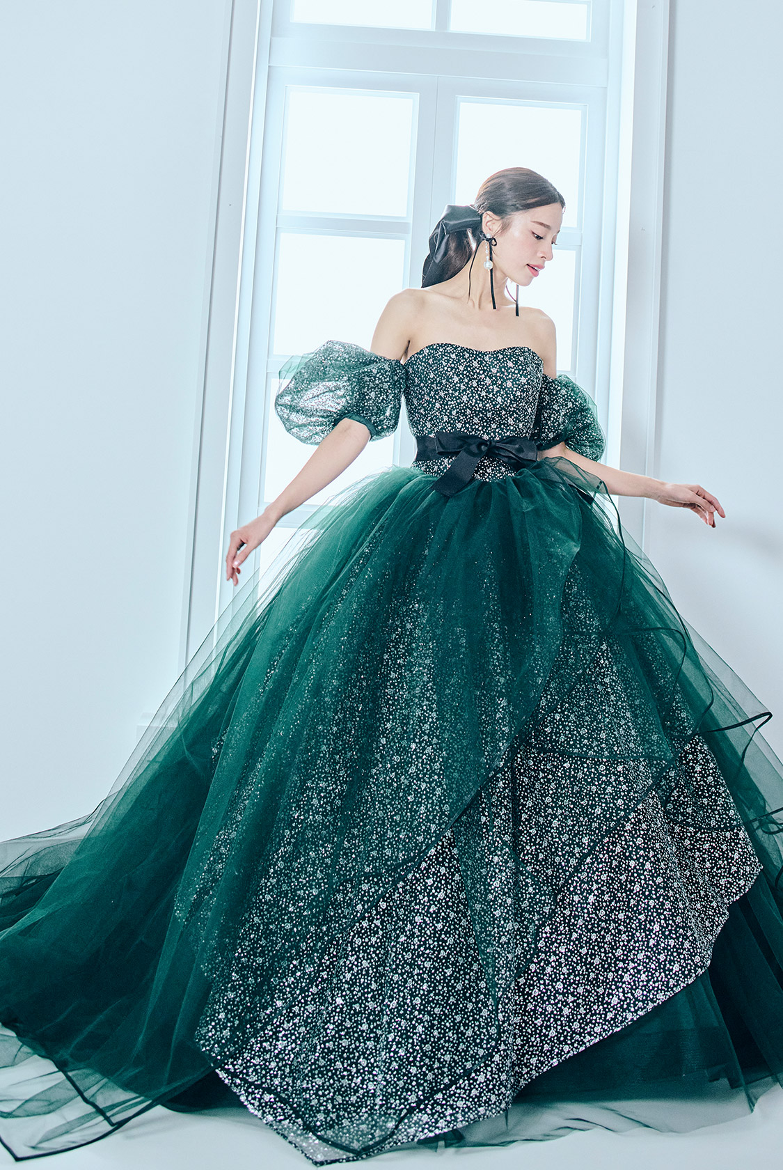 小さな薔薇の花模様のオリジナルグリッタープリントがキラキラと輝く中にも可憐でガーリーな雰囲気を醸し出します。複雑の構成のチュールスカートがかすみの様に重なって、動くたびに様々な表情を見せ、ゲストのため息を誘います。
