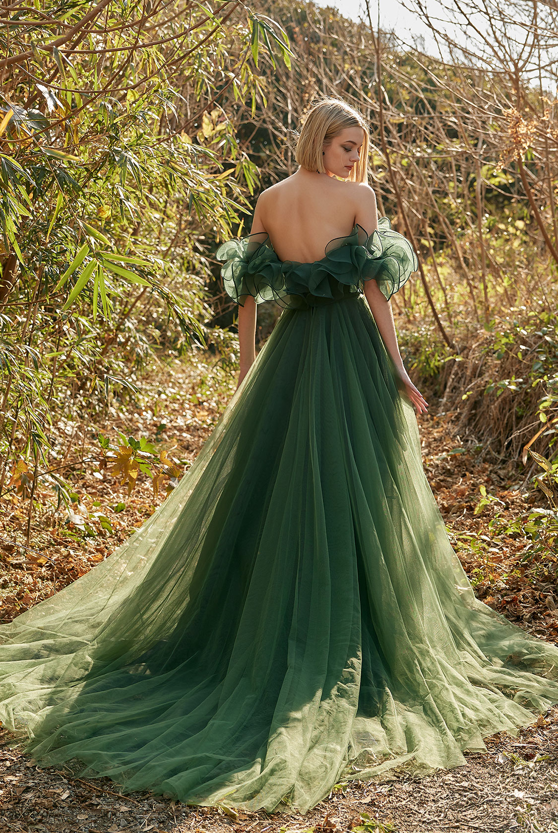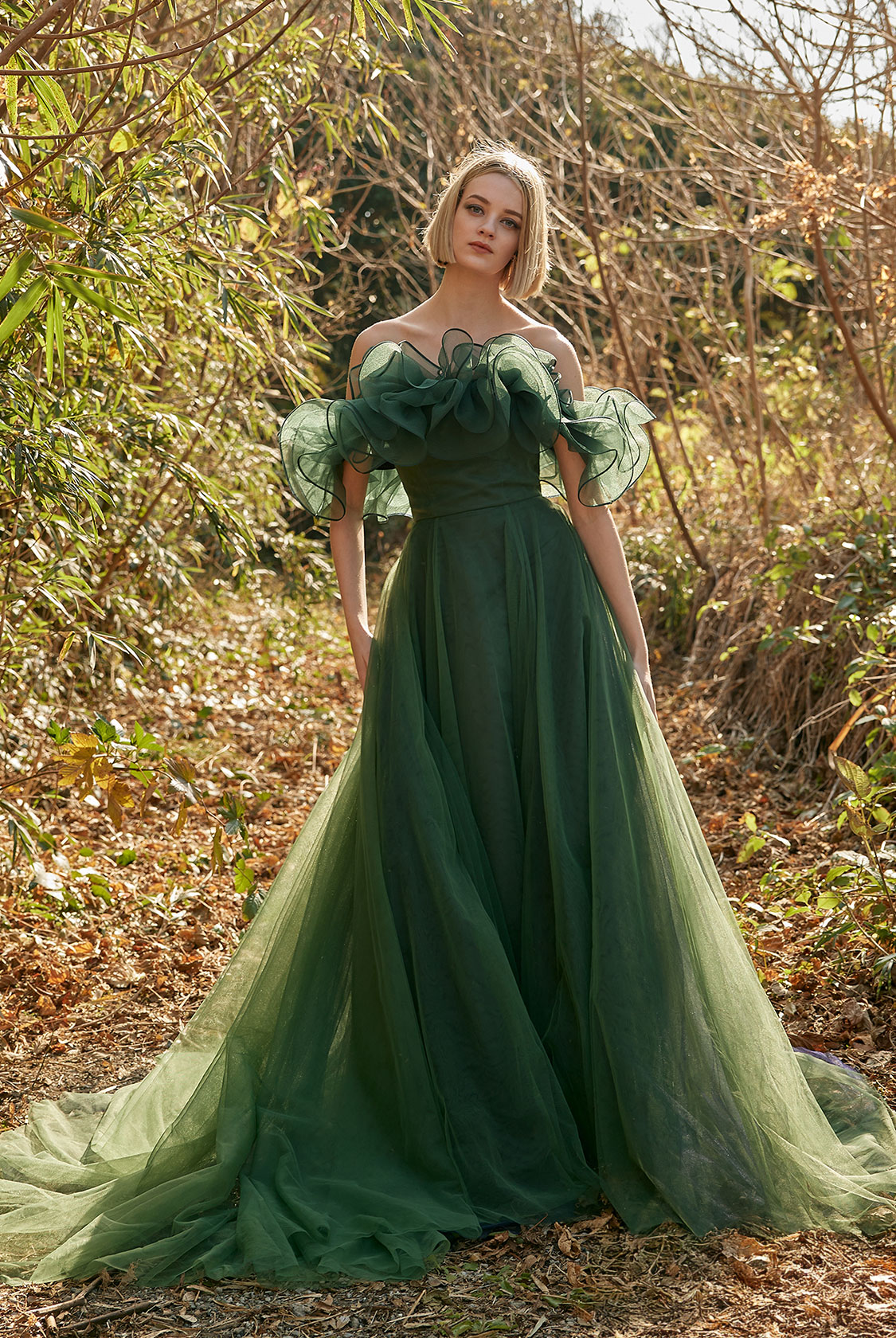 軽やかなチュールのボディに同色のワッシャーオーガンジーのオフショルダーフリルを組み合わせたスレンダードレス。ボリューム感のある胸元のフリルはホースヘアの曲線的な動きでよりソフトな印象に。たっぷりのチュールが使用されたスカートが奥行き感を演出します。