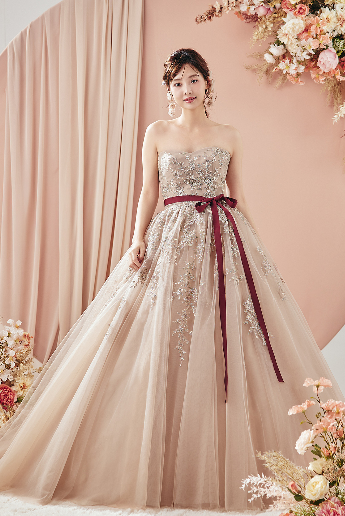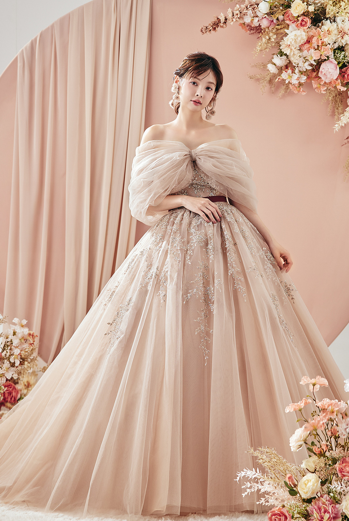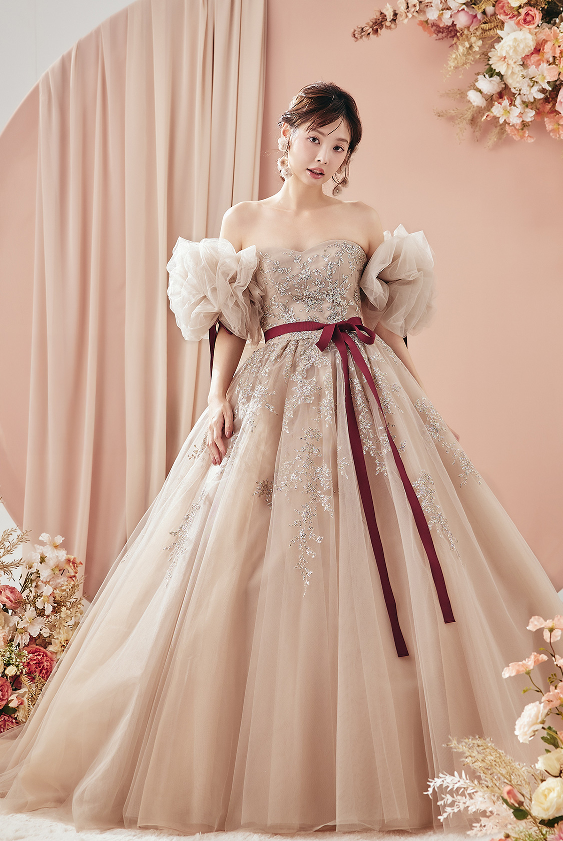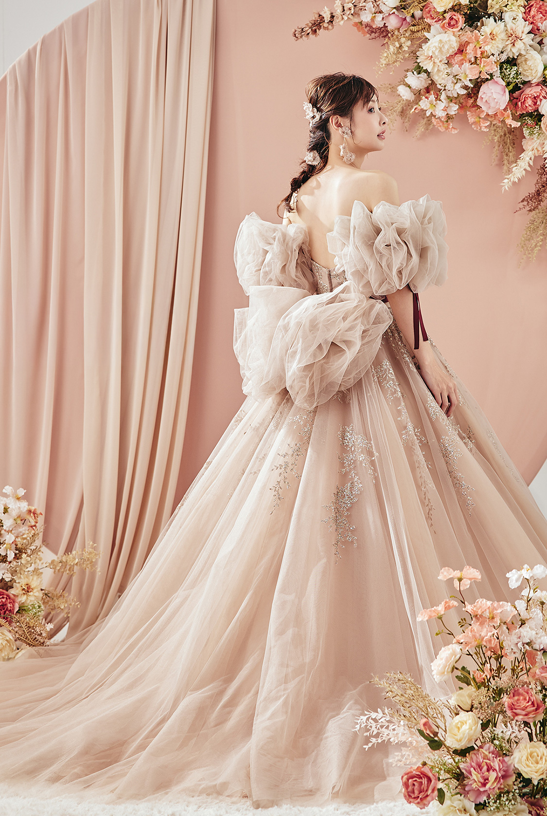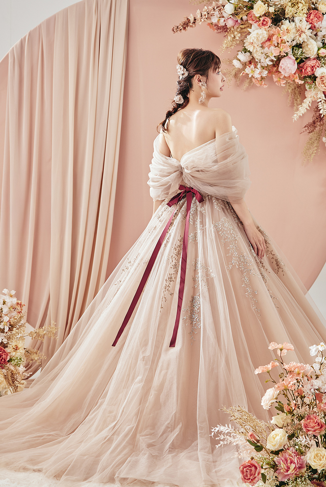 【Lulu felice(ルルフェリーチェ)×egg film(エッグフィルム)コラボレーションドレス】ニュアンスカラーのドレスにシャンパンゴールドのグリッタを施したチュールドレス。ビッグリボンイメージのチュールケープでソフトに優しく、袖と後ろには蝶をイメージしたリボンフリルが華やかでキュートにアレンジして着こなせます。