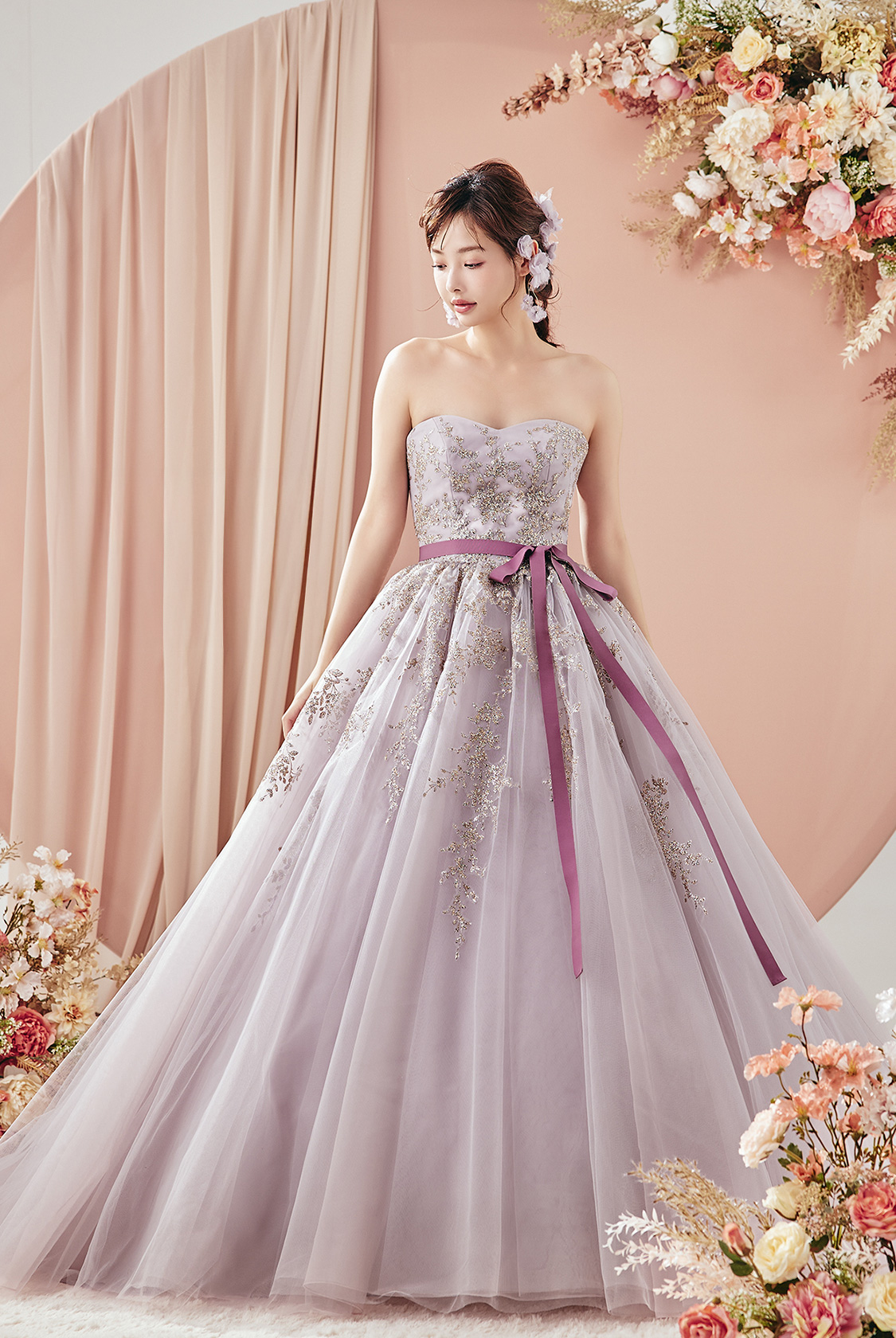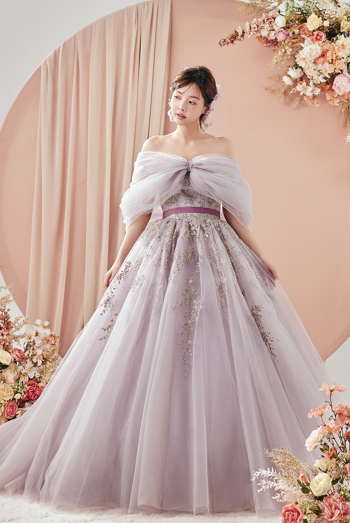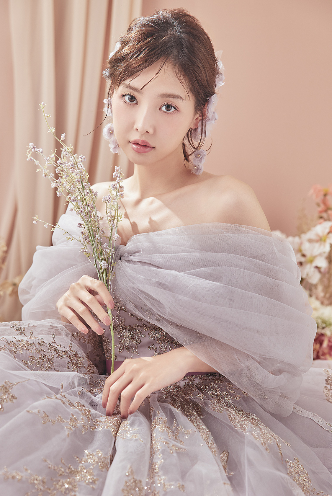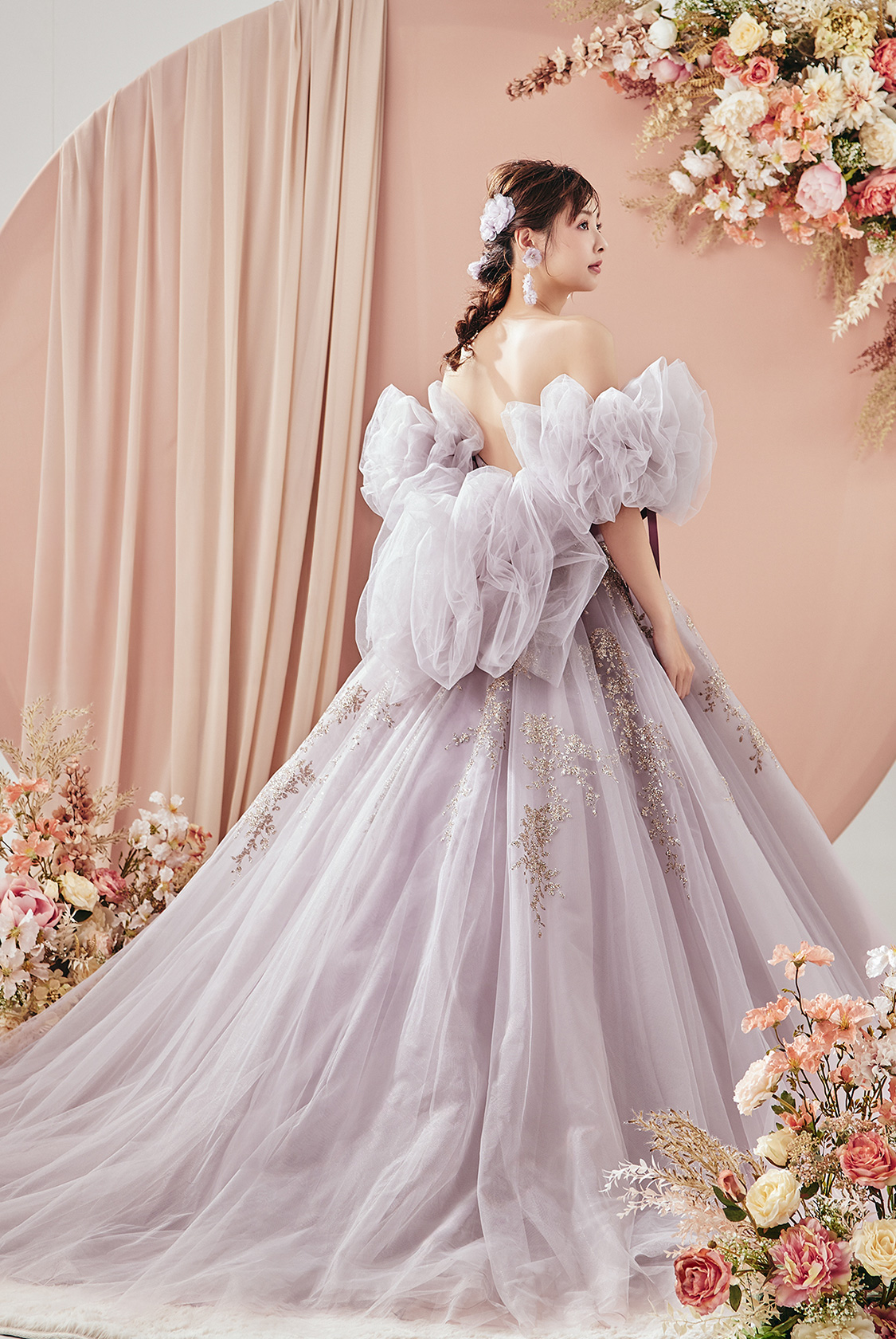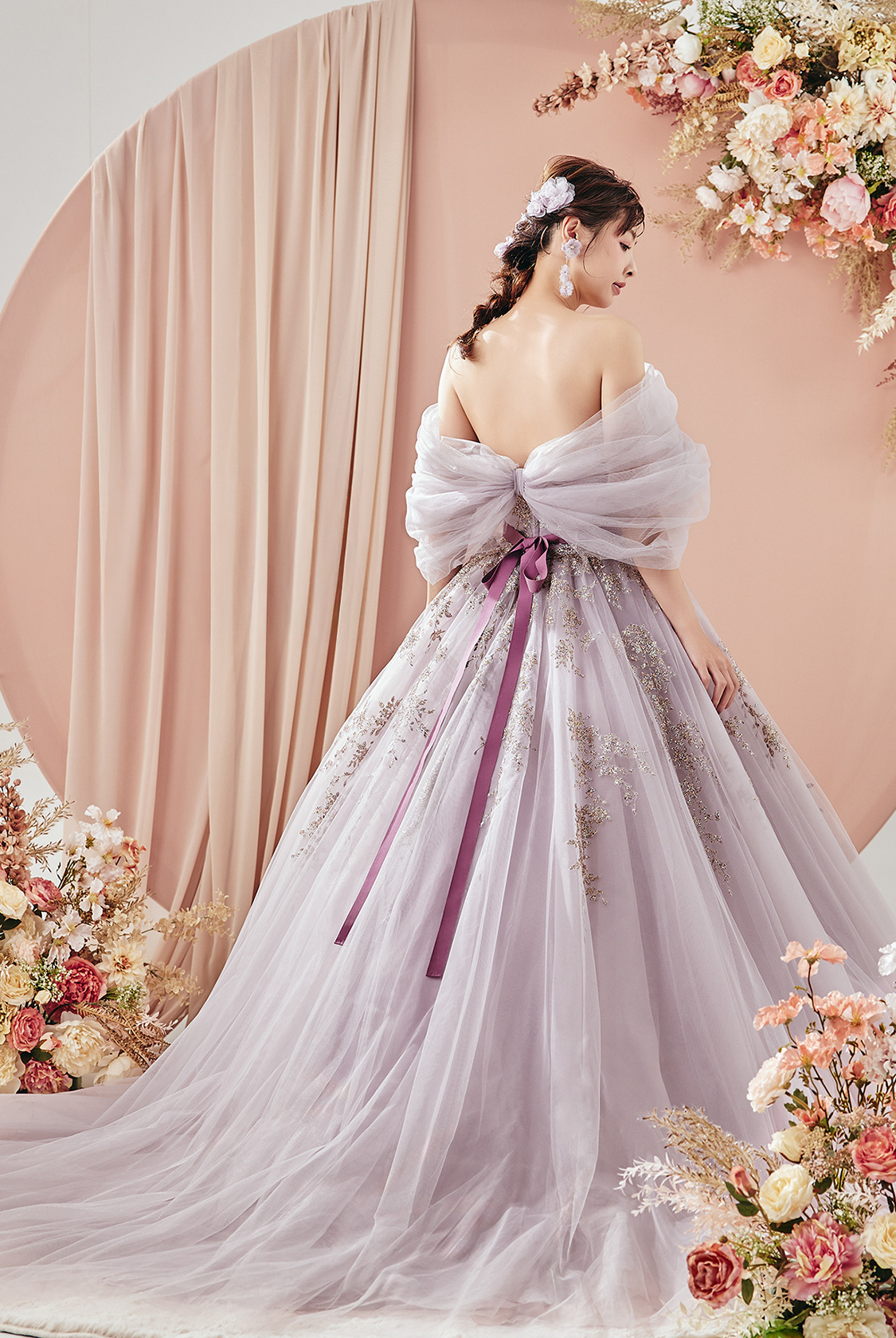 【egg film(エッグフィルム)コラボレーションドレス】ニュアンスカラーのドレスにシャンパンゴールドのグリッタを施したチュールドレス。ビッグリボンイメージのチュールケープでソフトに優しく、袖と後ろには蝶をイメージしたリボンフリルが華やかでキュートにアレンジして着こなせます。