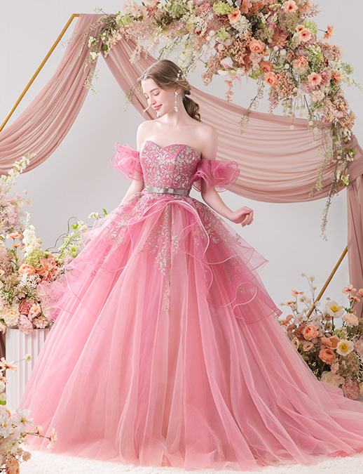 【eggfilm(エッグフィルム)コラボレーションドレス】ふんわりひらひらのオフショルダーが印象的で、二の腕をさりげなく可愛くカバーします。こだわりは「カラー刺繍」と「グリッターモチーフ」を組み合わせた配色バランス。取り外しアイテムで自分好みのコーディネートを。