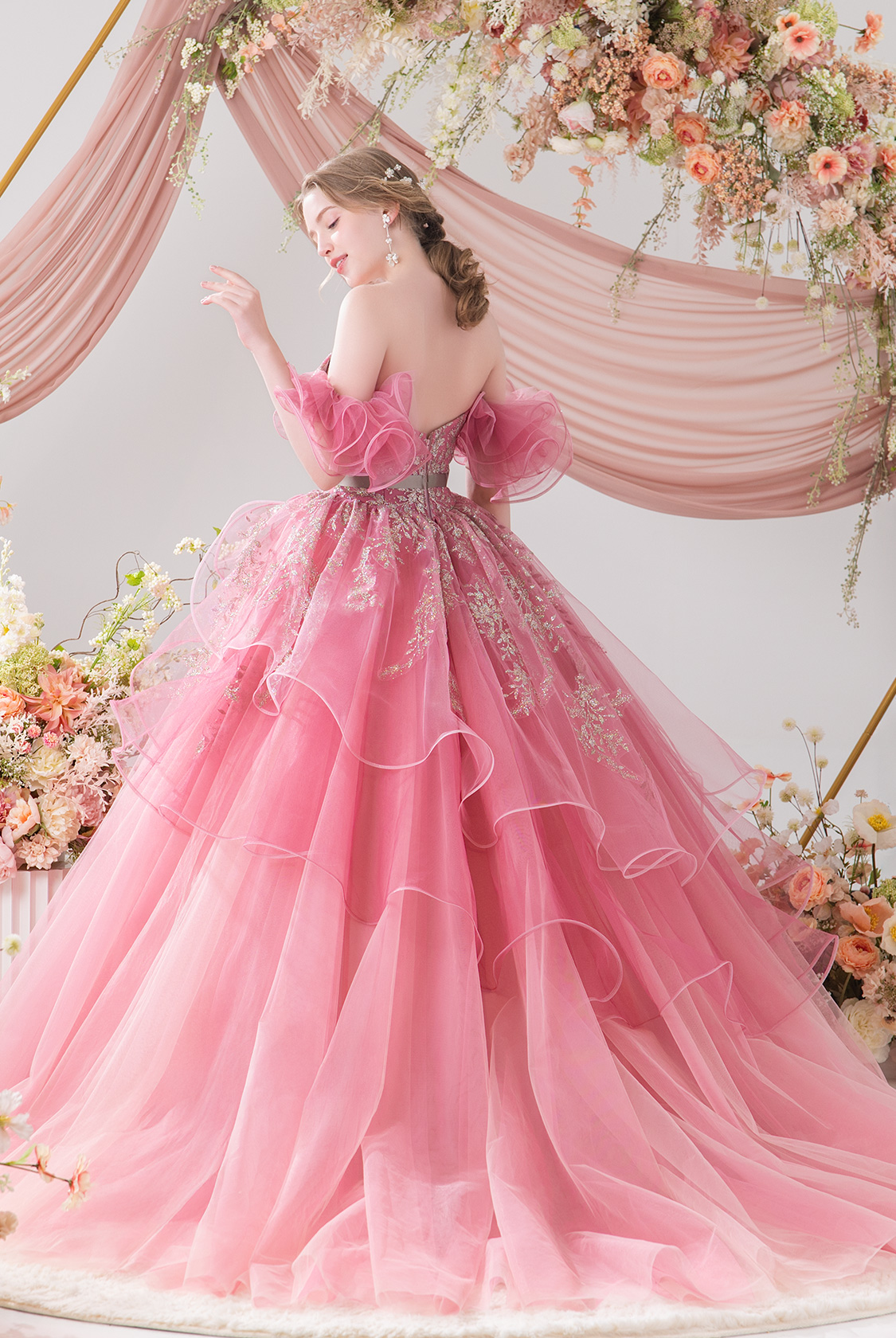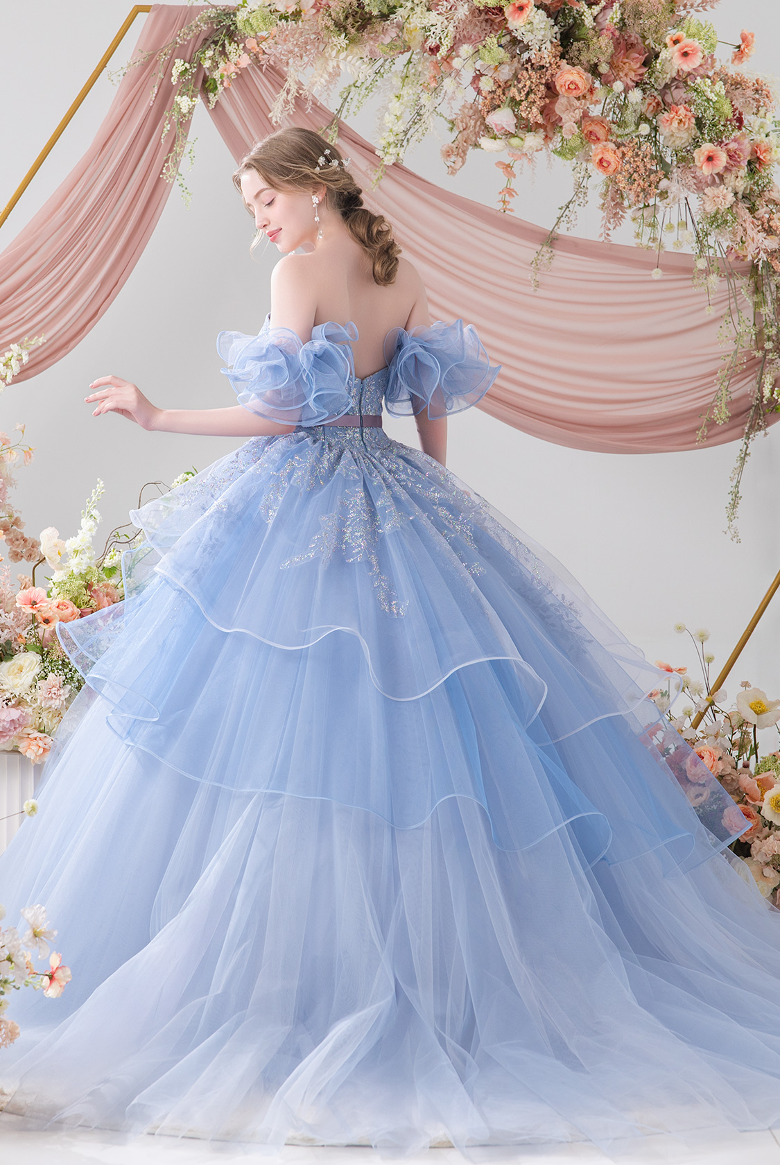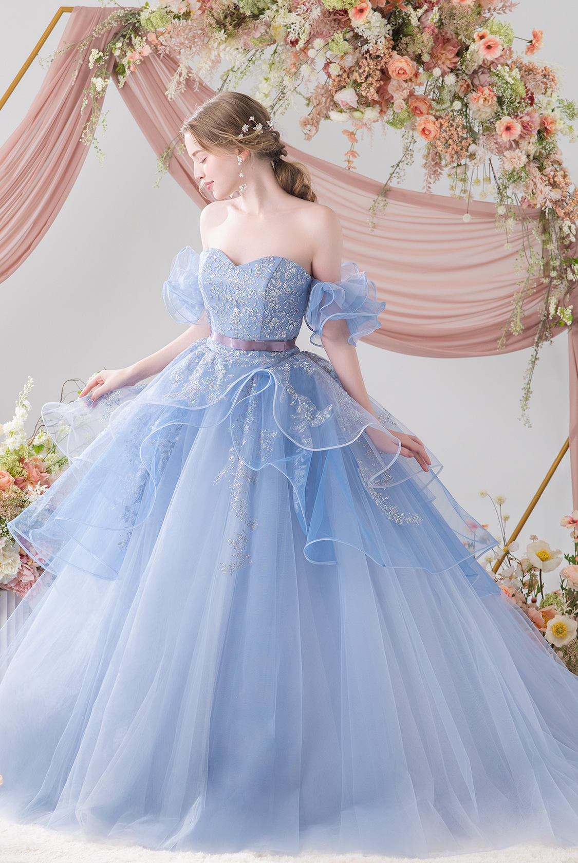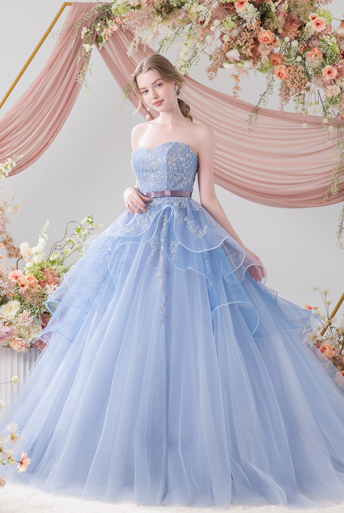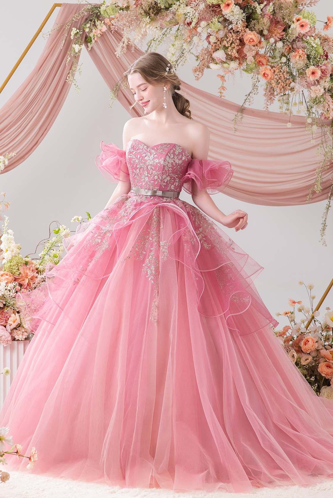 【eggfilm(エッグフィルム)コラボレーションドレス】ふわふわフリル×きらきらグリッターで、かわいいをぎゅっと詰め込んだ一着。ウエストのリボンで甘さを引き締めつつ、気になるスタイルもさりげなくカバー◎