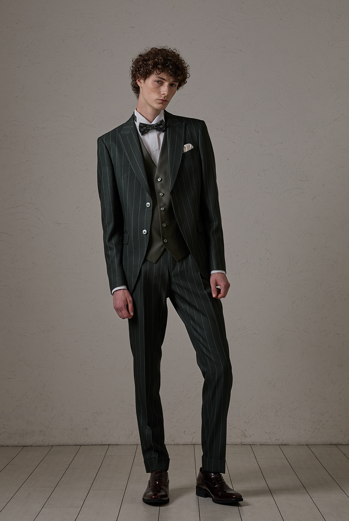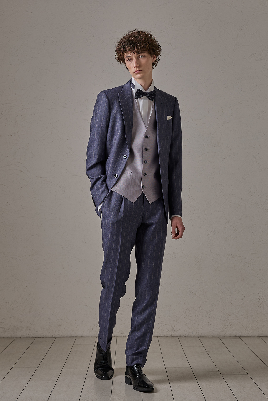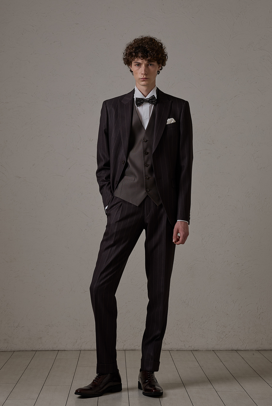【KURAUDIA×SHIGEO MACCHINO】大柄のストライプが特徴のストライププリントを上下に使用したタキシード。同系色コントラストのベストをコーディネートし、大胆なスタイルの中にもシックな要素を加味しています。