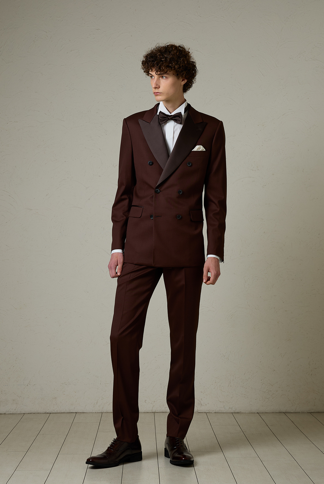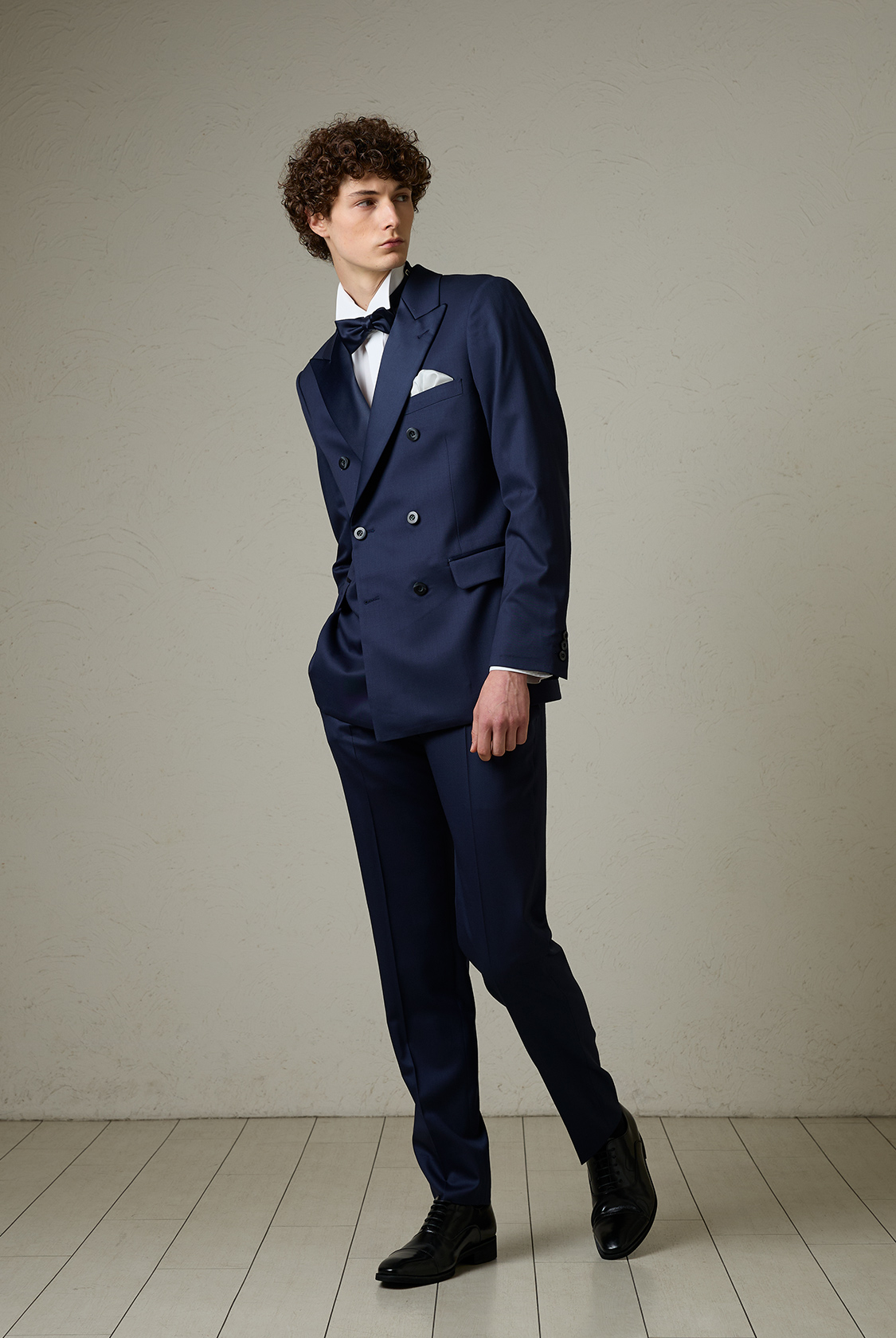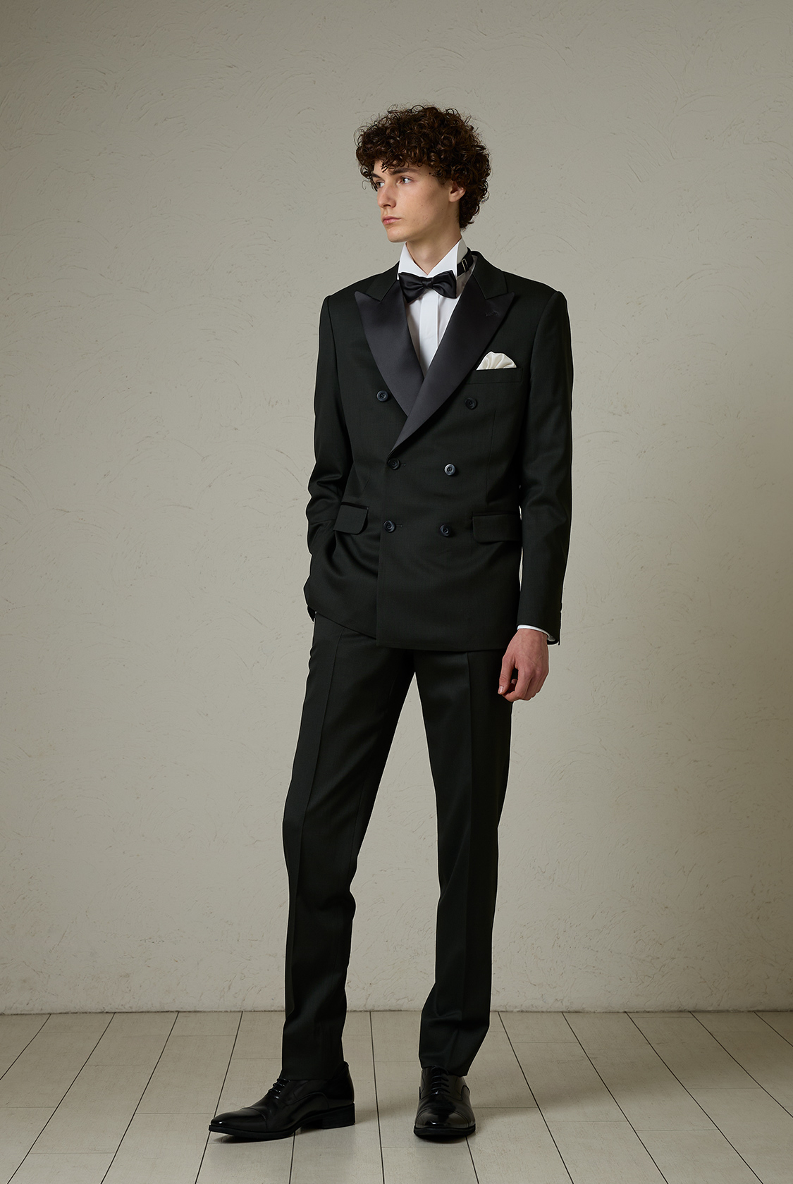 ラペルにサテンを使用し、オーセンティックフォーマルを意識したダブルブレストのピークドラペルのタキシード。程よいストレッチ性を持たせた素材を使用することで窮屈感を払拭したコンフォータブルな着心地です。